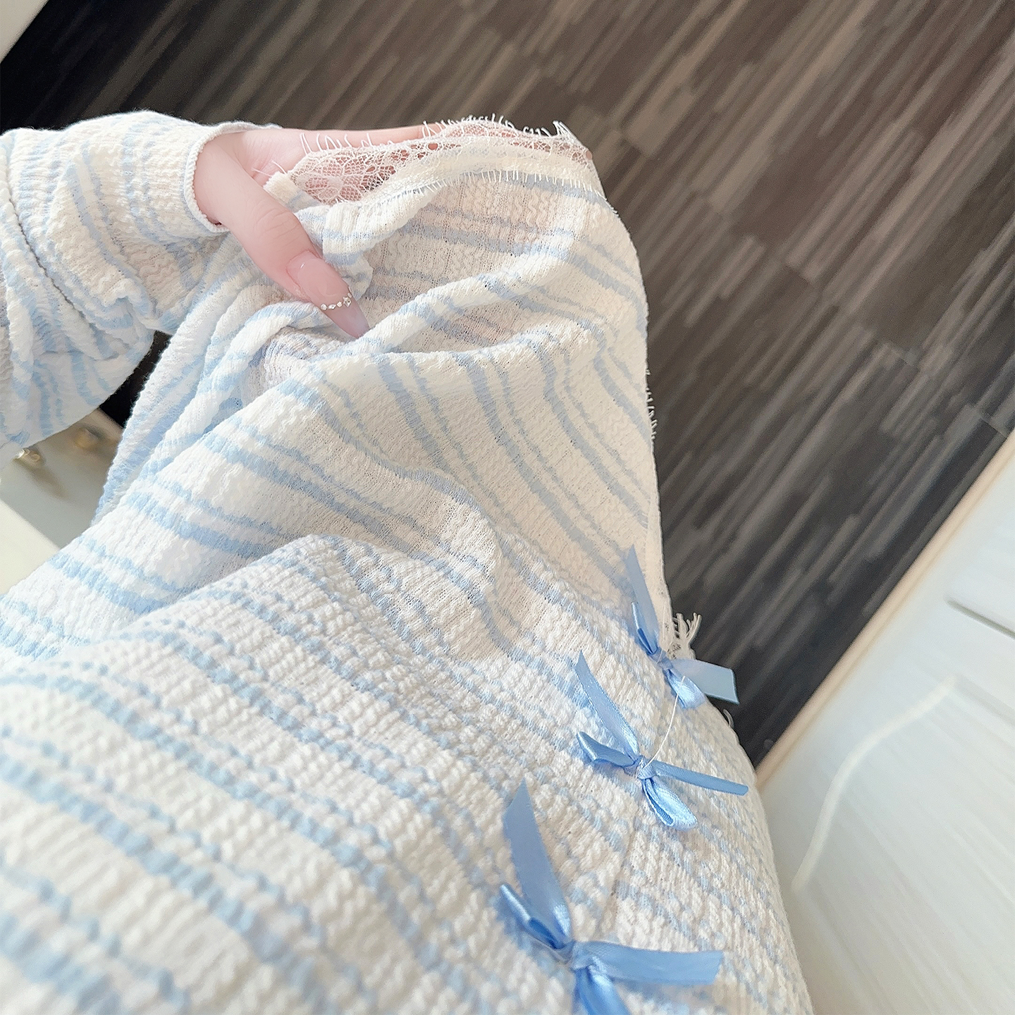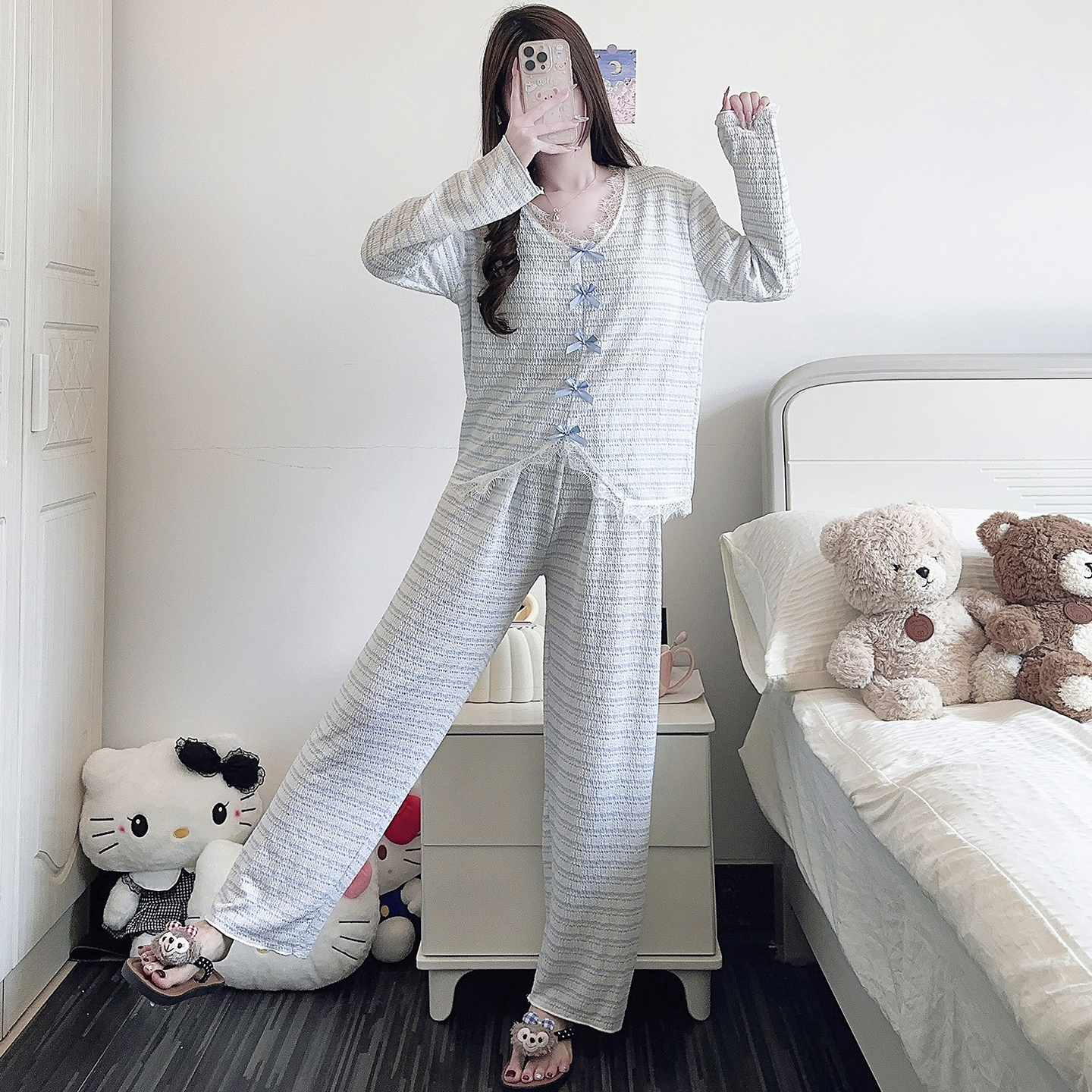 冬高级感网红条纹家居服 甜美蕾丝花边套装 带胸垫睡衣女春秋季 长袖