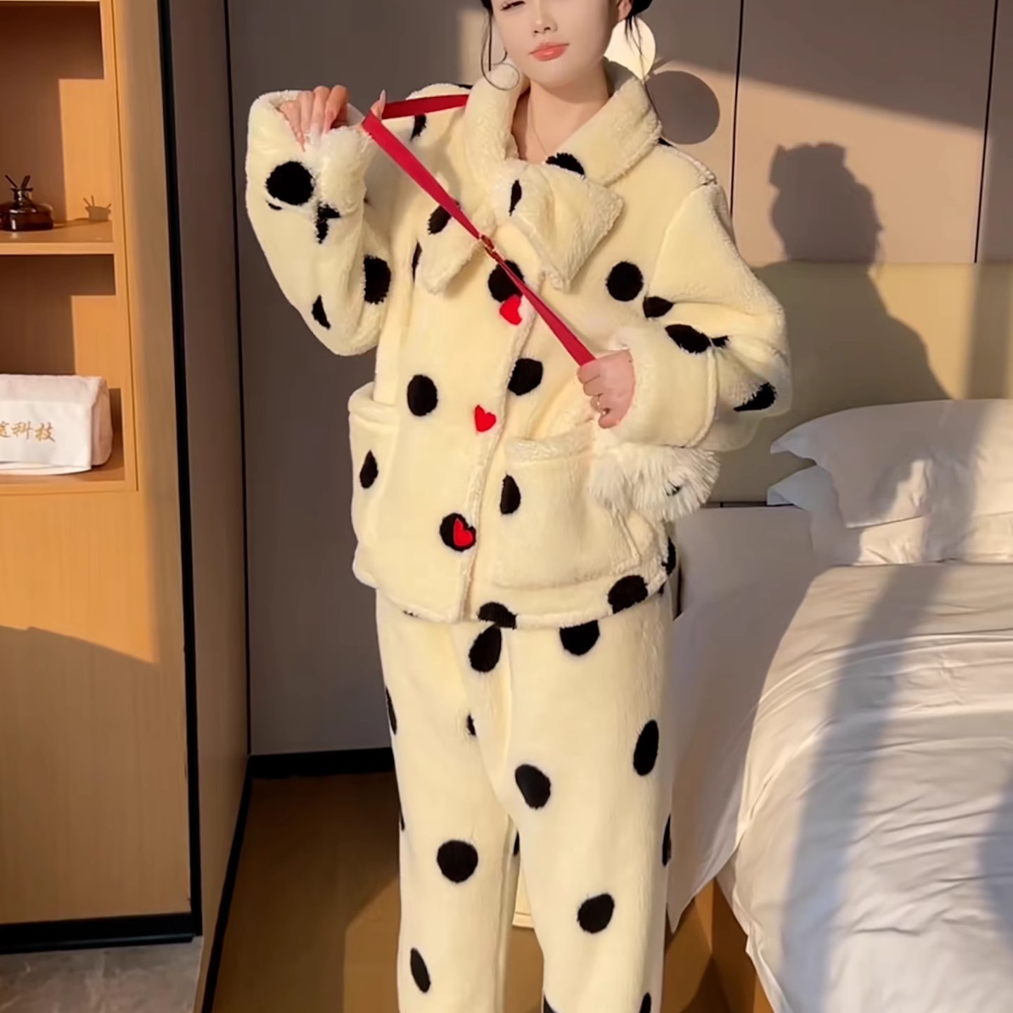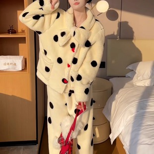 2025年新款 毛绒绒可爱家居服套装 休闲保暖波点睡衣女 气质韩版 冬季