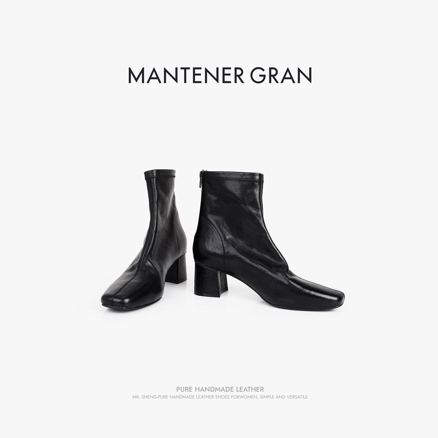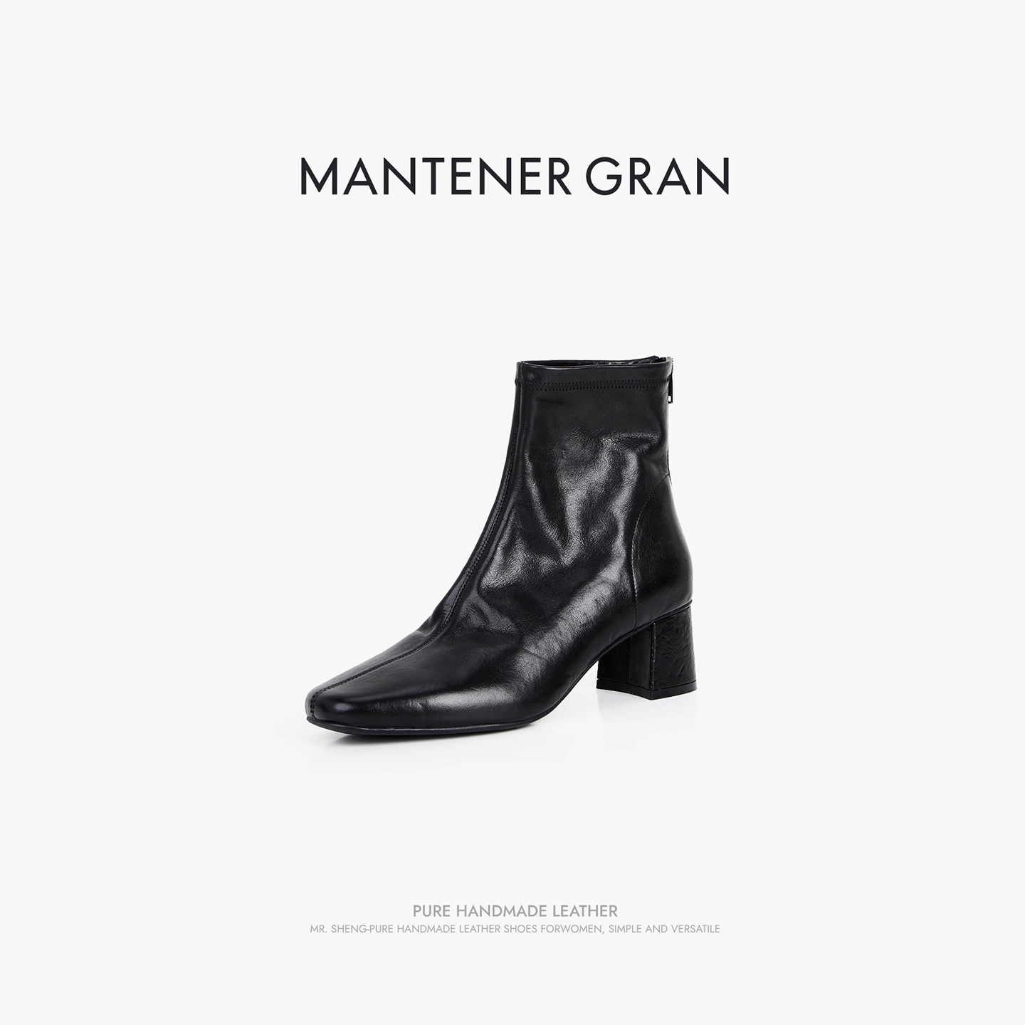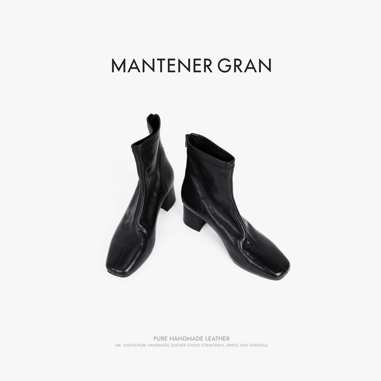MantenerGran复古水洗牛皮靴子女粗跟高跟短靴瘦瘦靴 MG女鞋