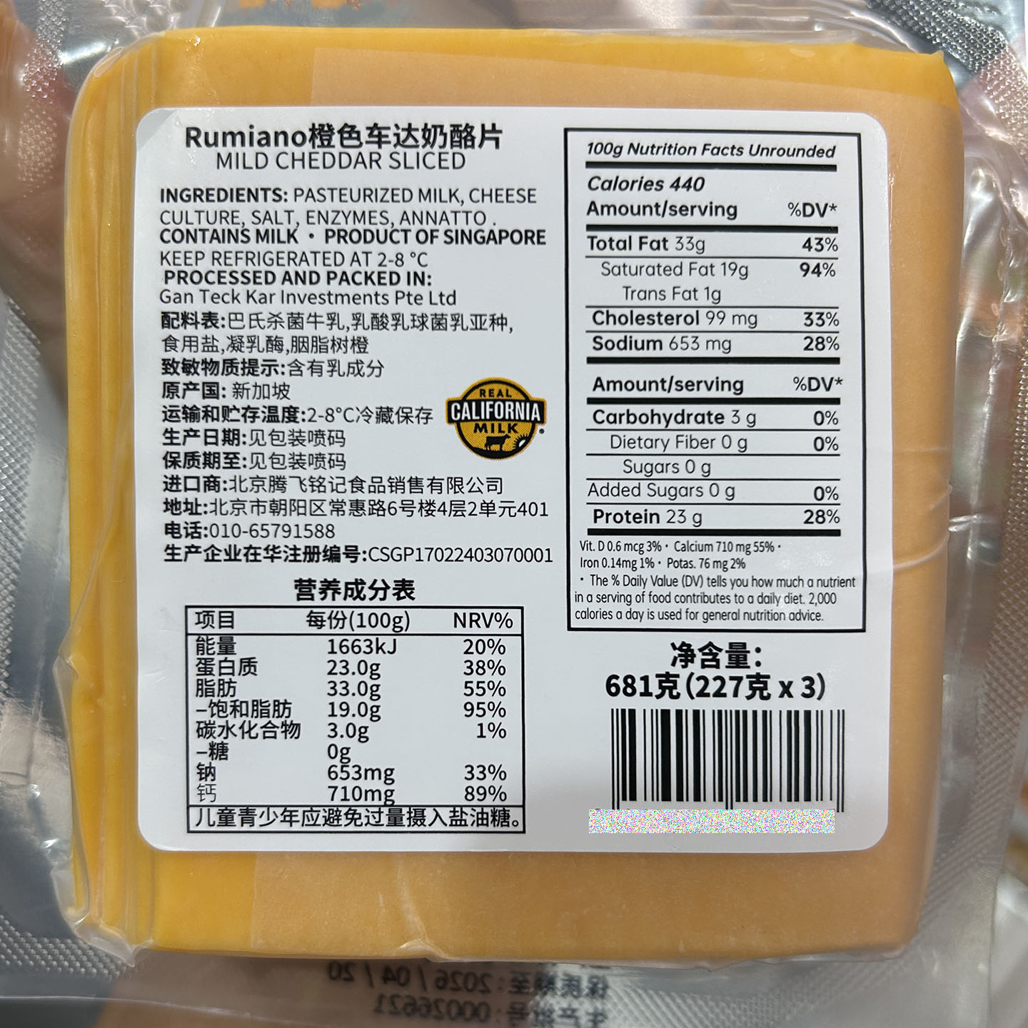 山姆代购 3天然牛奶奶酪 新加坡进口Rumiano橙色车达奶酪片227g