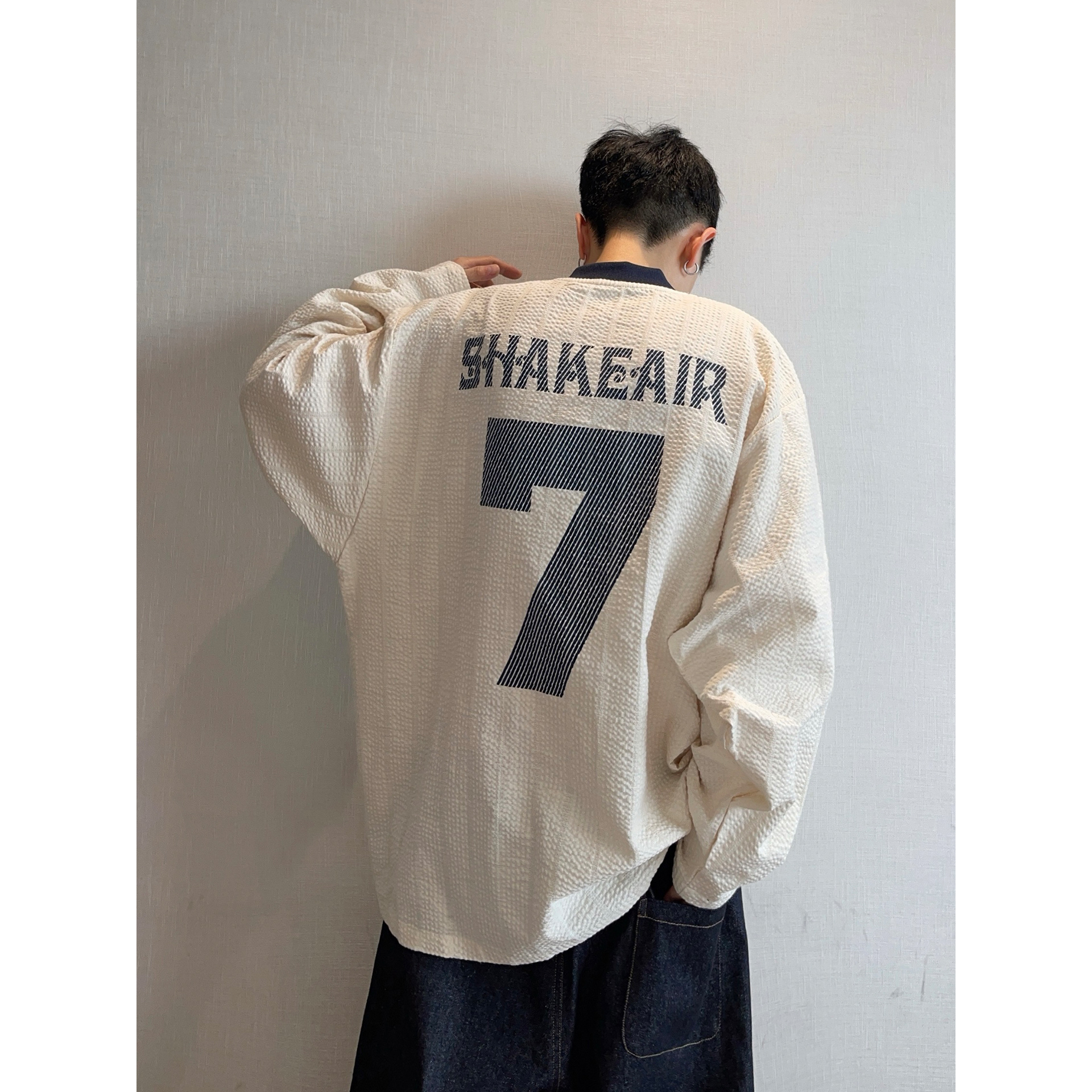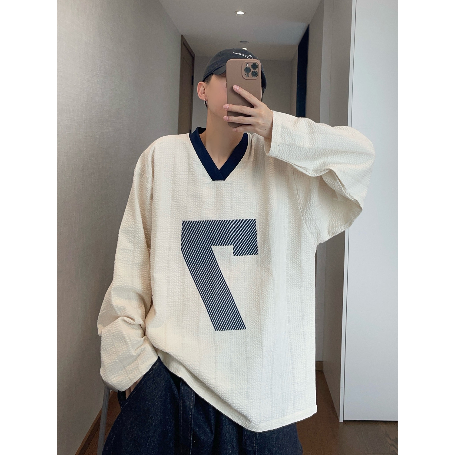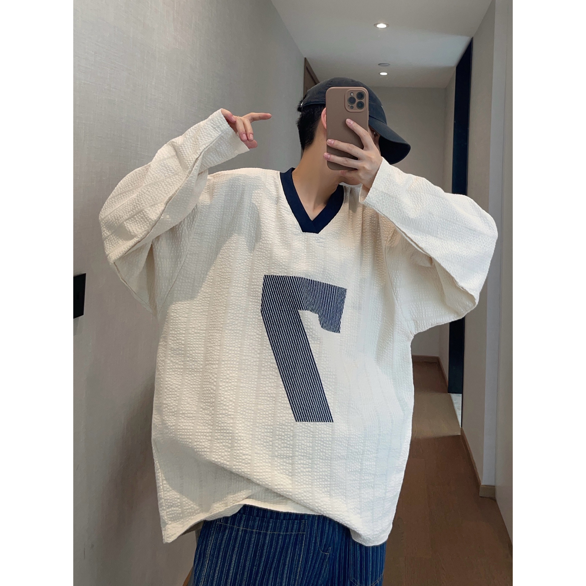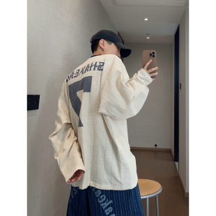 情侣装 特大码 T恤男女春秋薄款 字母数字V领设计长袖 上衣 300斤美式