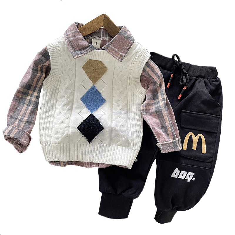 套装 杏色蕾丝拼接长袖 叠穿格子马甲背心流苏阔腿裤 新款 T恤女秋季
