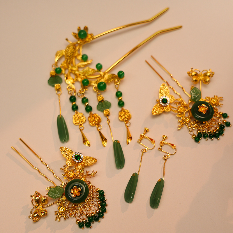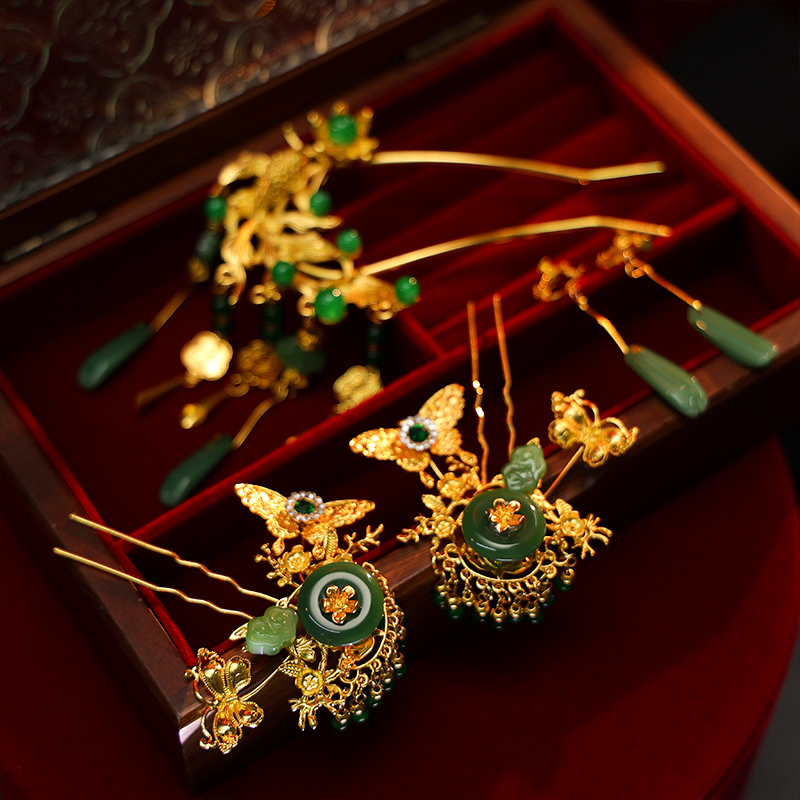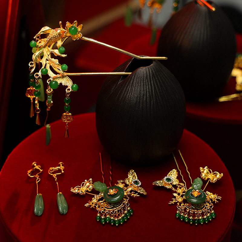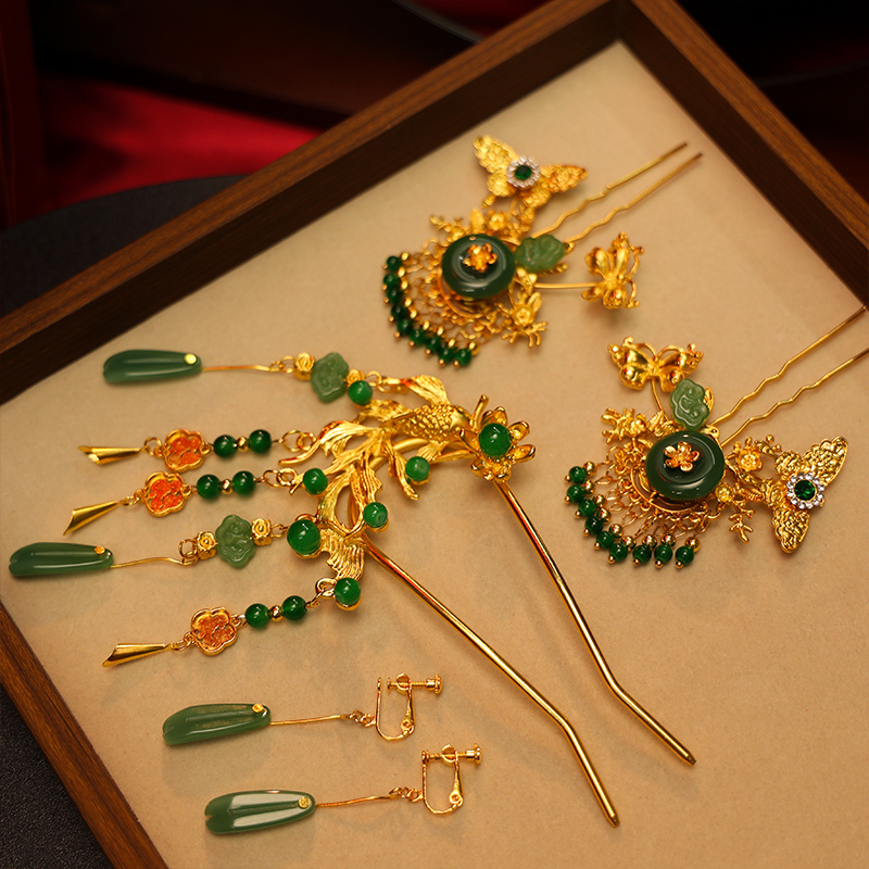 金绿色古典新娘高级感头饰蝴蝶发簪锦鲤国风晨袍礼服秀禾服发饰品