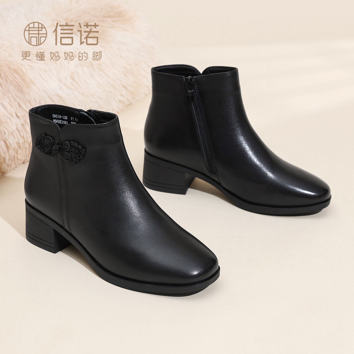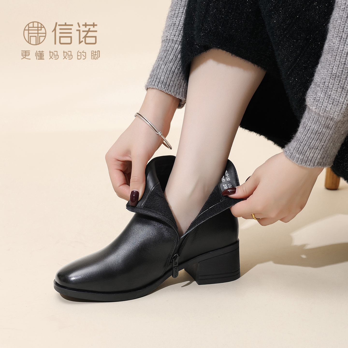新款 女2025冬季 皮鞋 信诺真皮妈妈短靴粗跟靴子中老年加绒保暖棉鞋