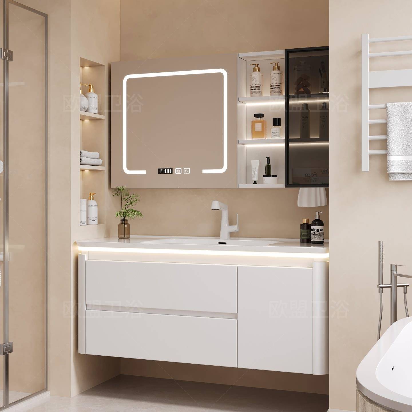 法式 奶油风陶瓷一体智能浴室柜镜柜组合卫生间收纳洗漱台洗脸盆