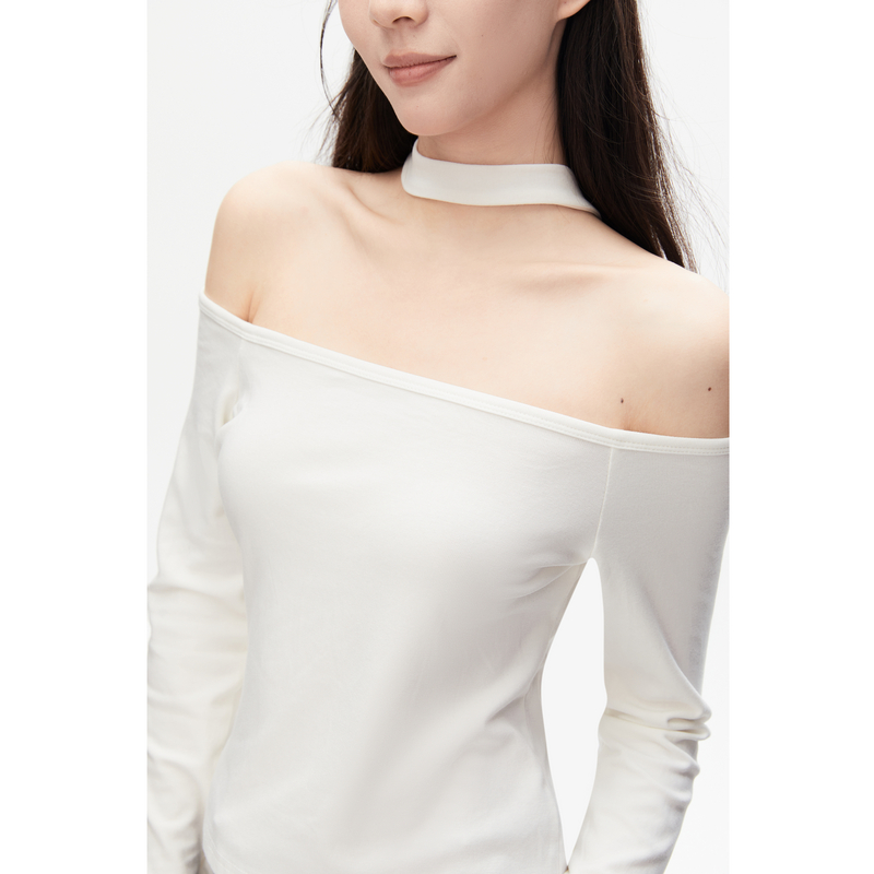 VIVICATHY2025秋冬一字肩挂脖T恤女白色纯欲辣妹打底衫 上衣 短款