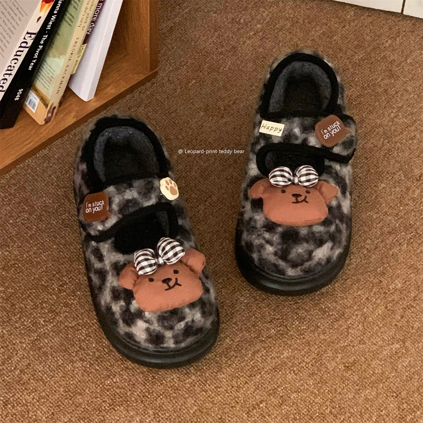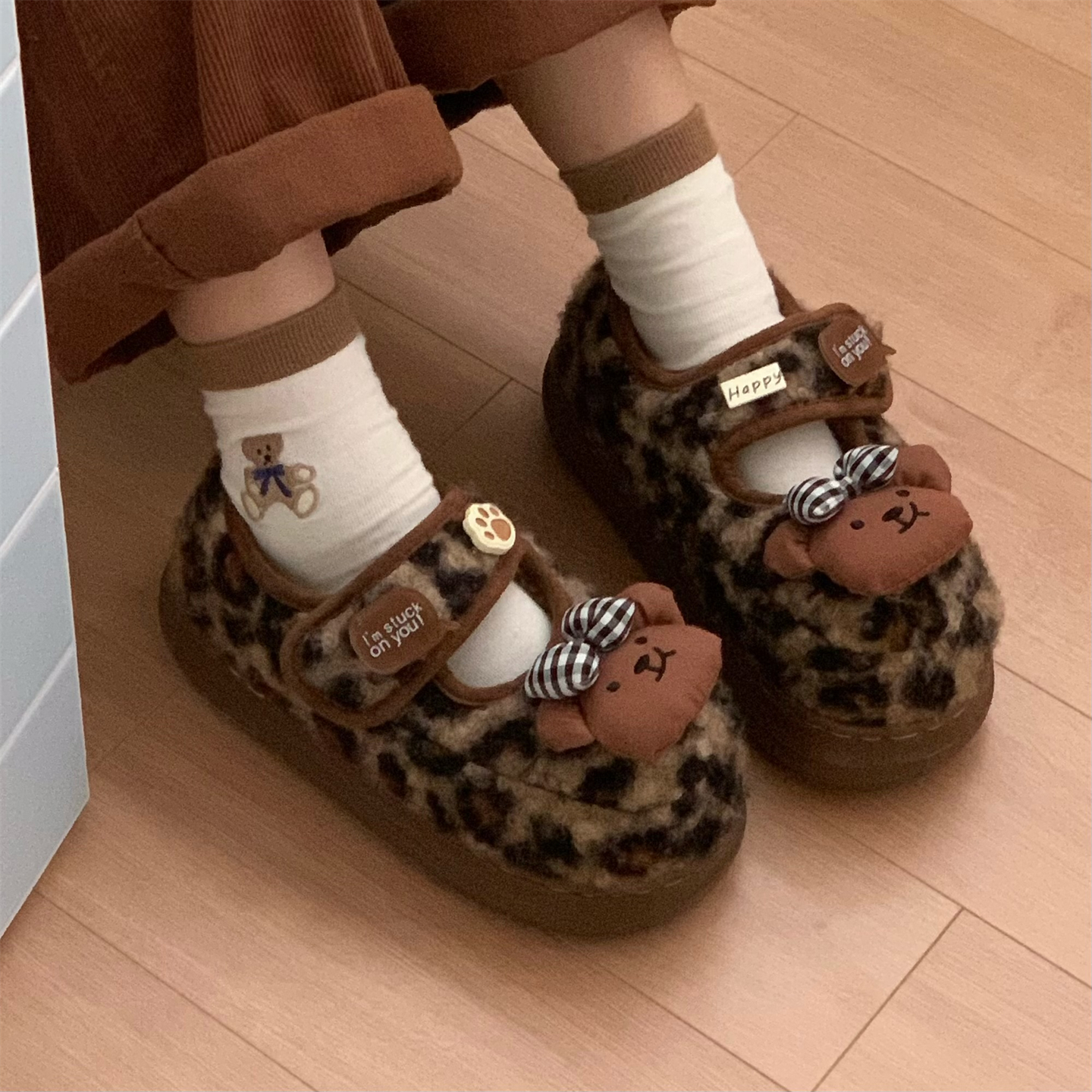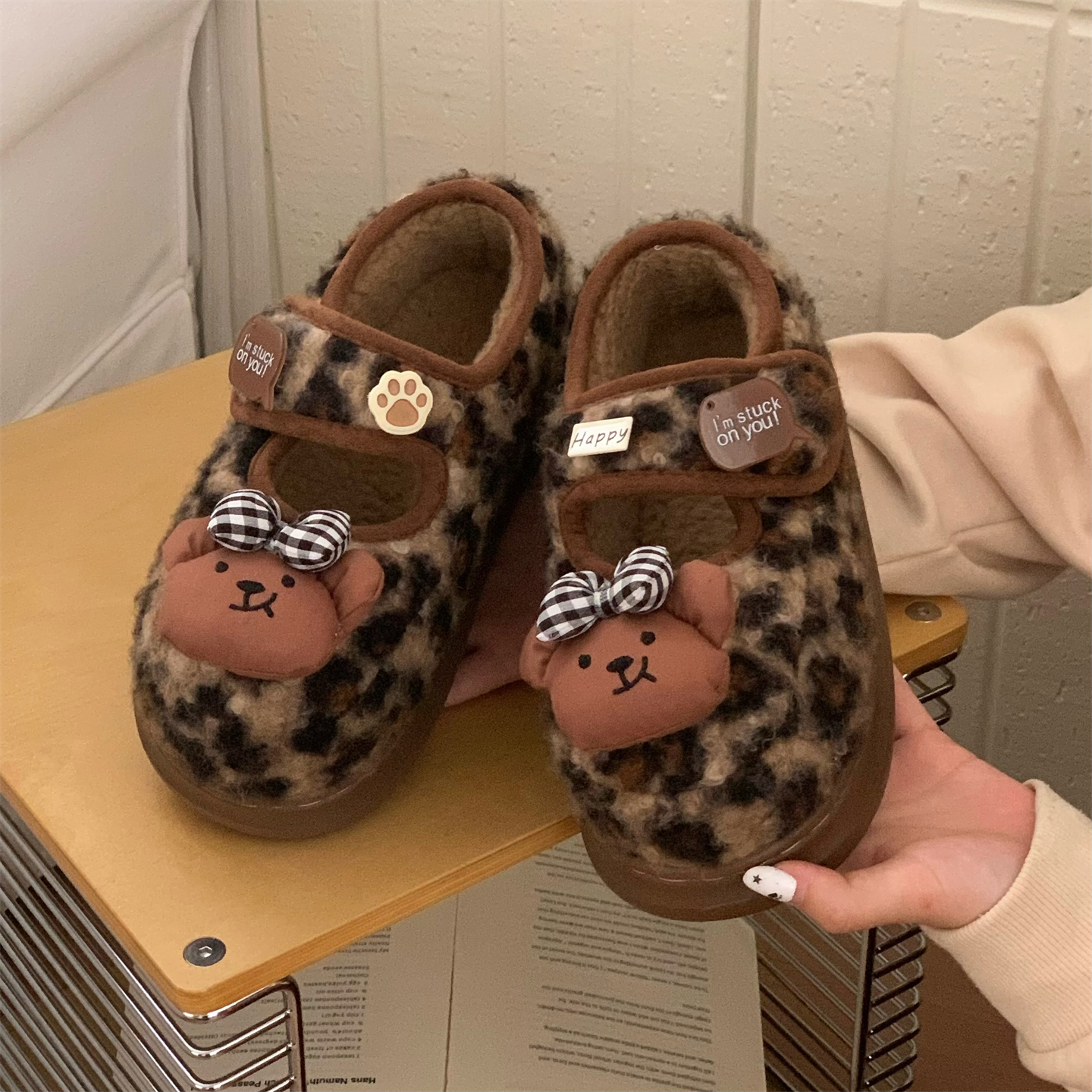 冬季 豹纹魔术贴学生毛毛鞋 女时尚 可爱小熊ins防滑外穿玛丽珍棉鞋