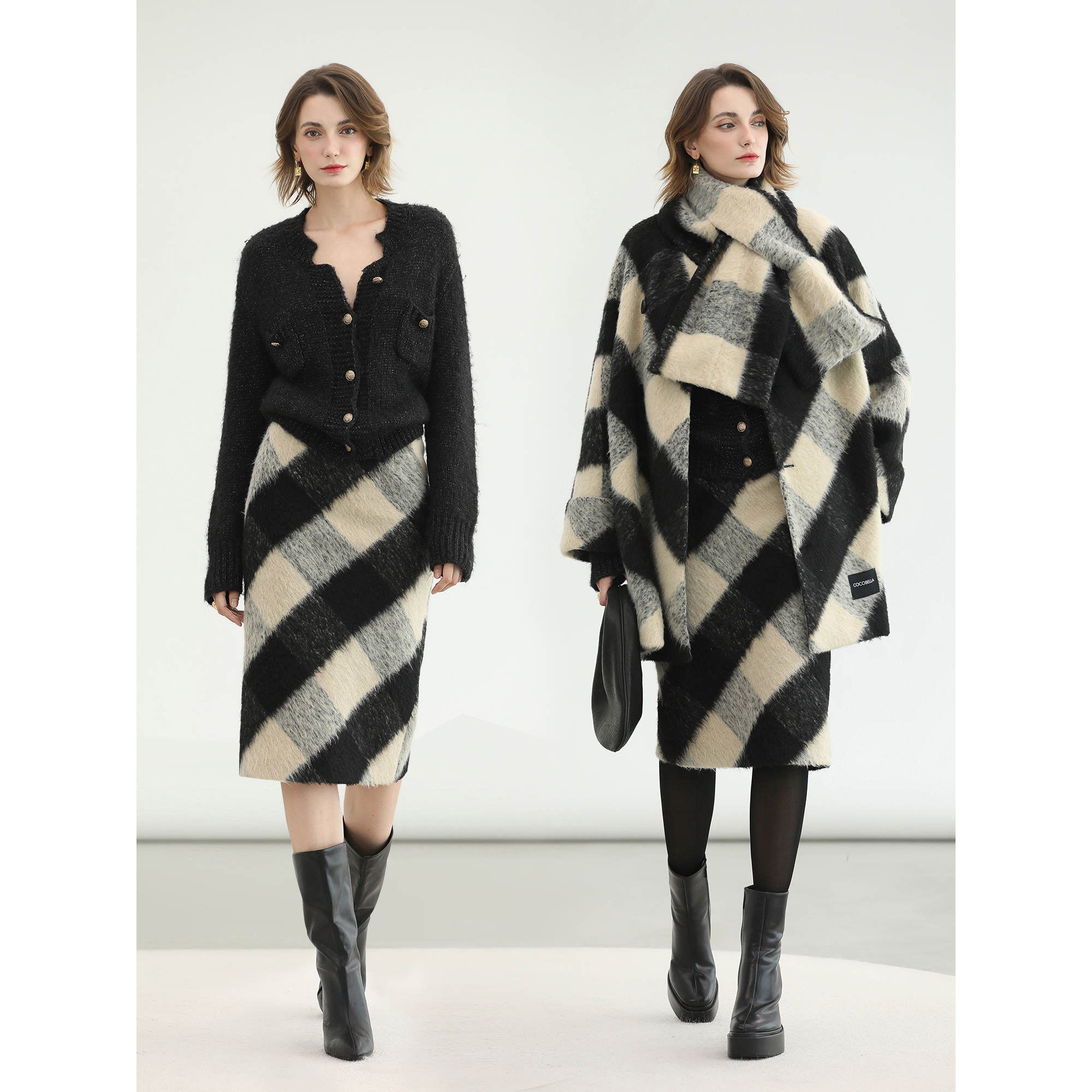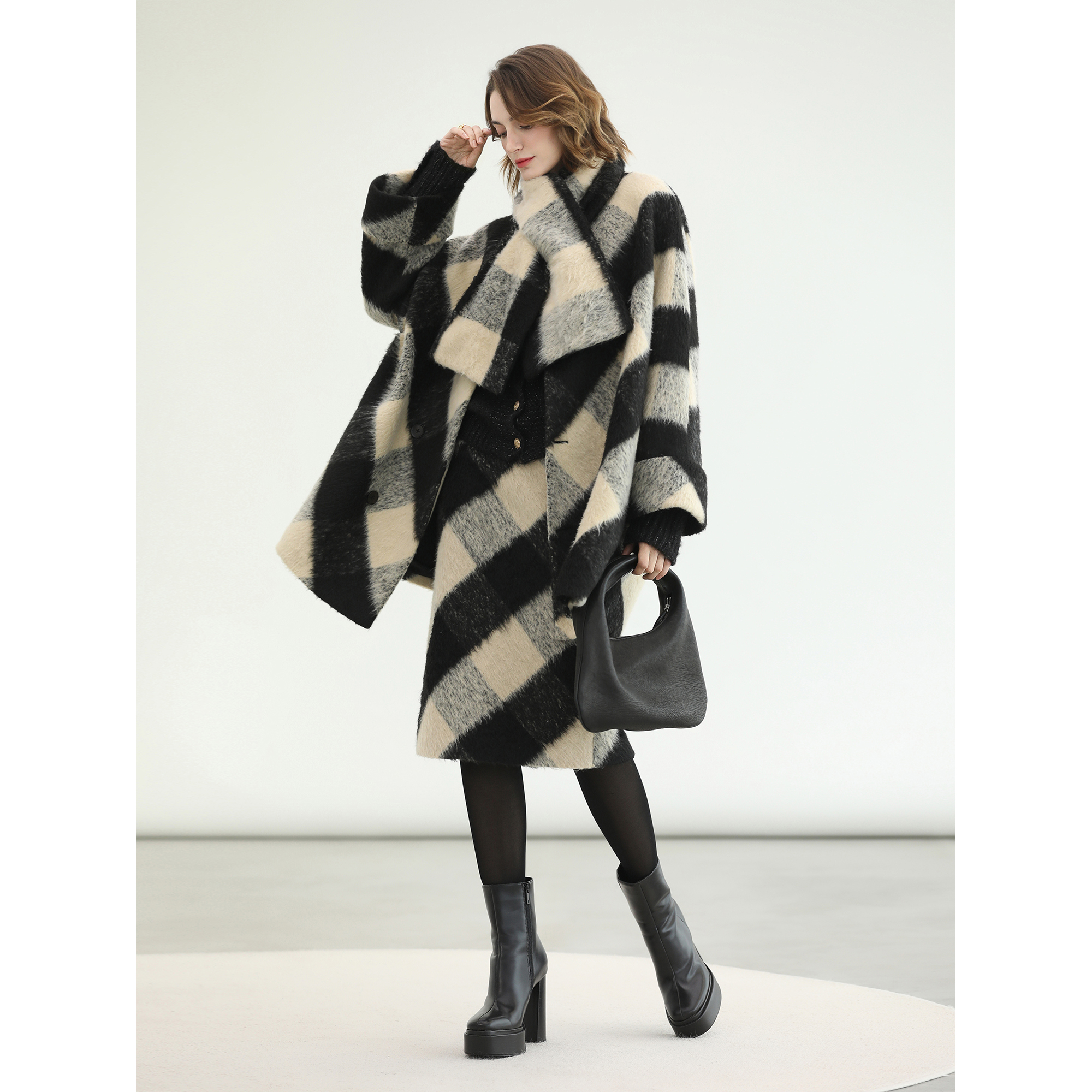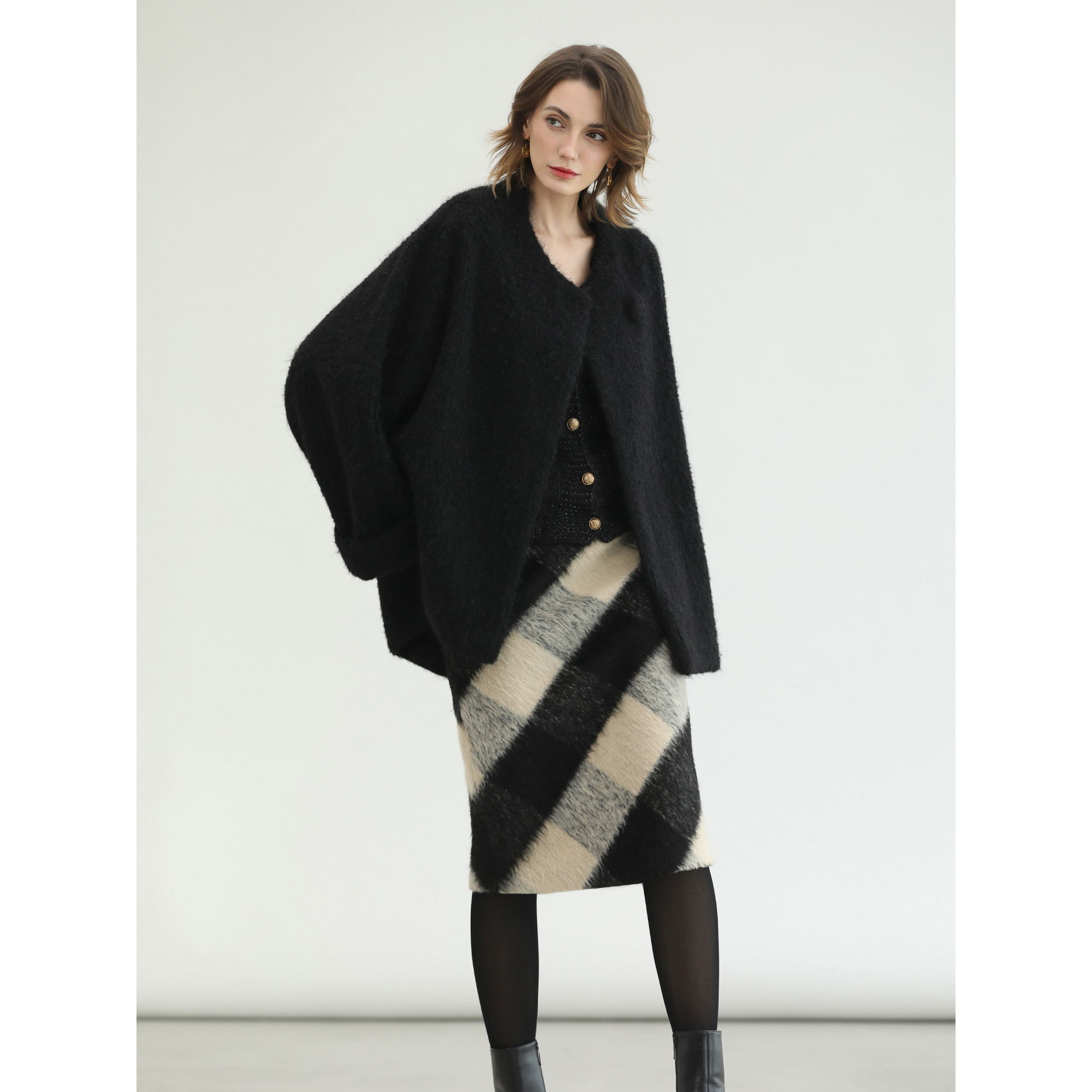 ONLY2025秋冬新款 半身裙女 复古格纹印花纱网不对称下摆A字中长款