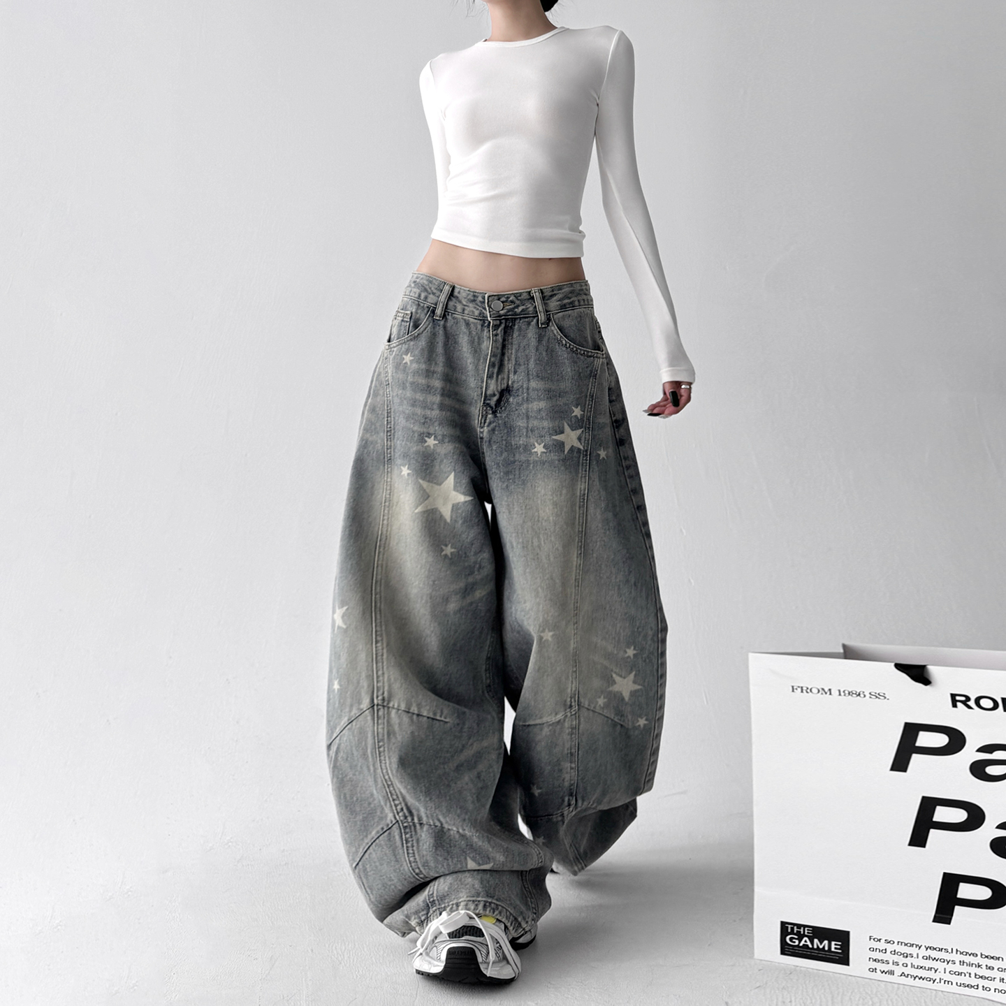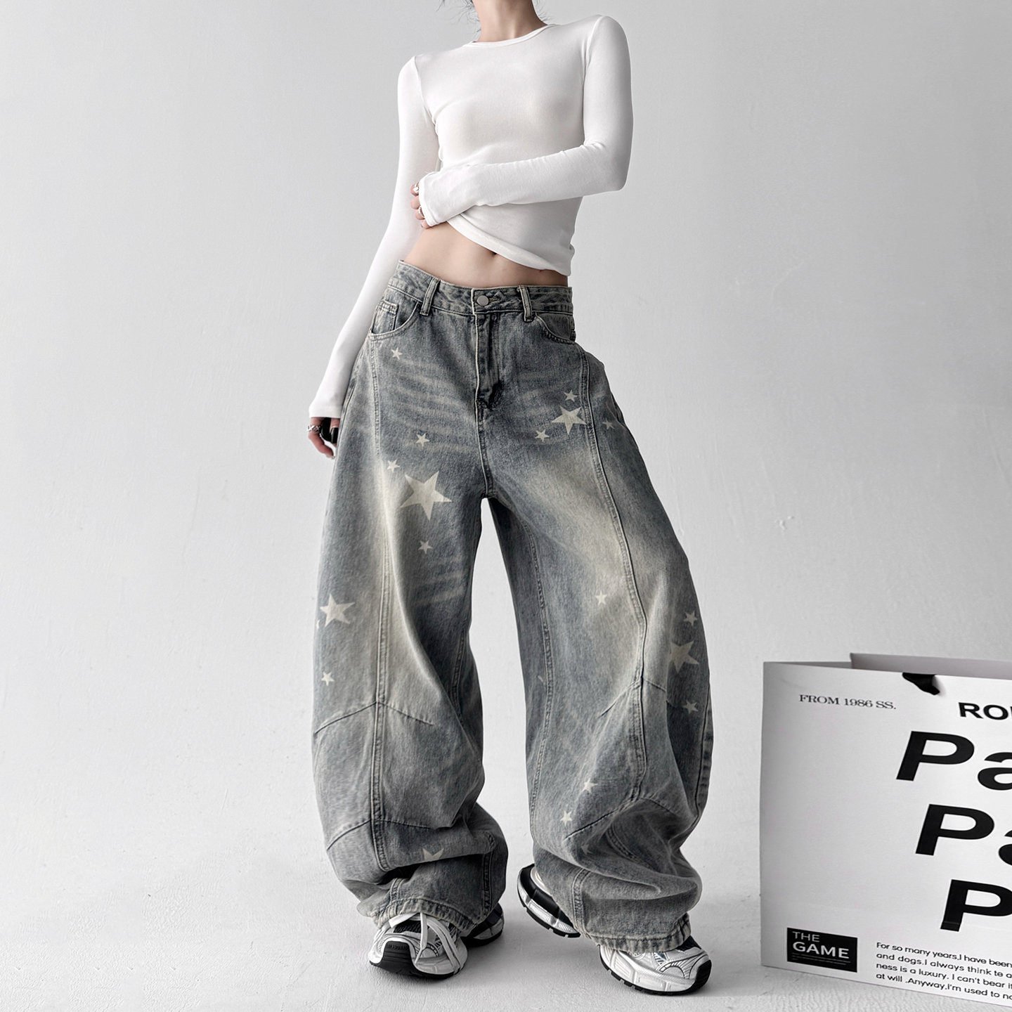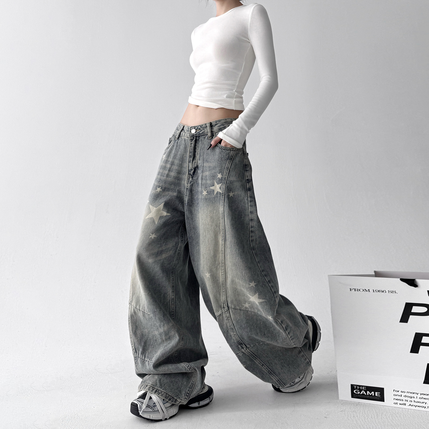 春秋高腰阔腿韩系慵懒风休闲裤 女2025新款 复古星星印花牛仔裤 美式