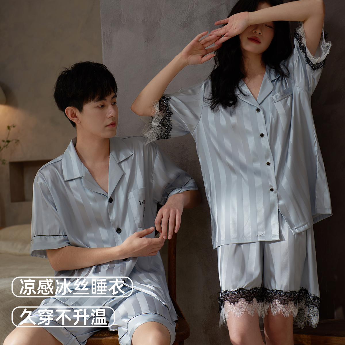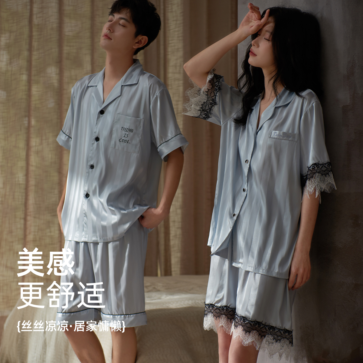 套装 蜜蜂欢乐社情侣睡衣冰丝春夏季 男女长袖 短裤 高级感家居服 短袖