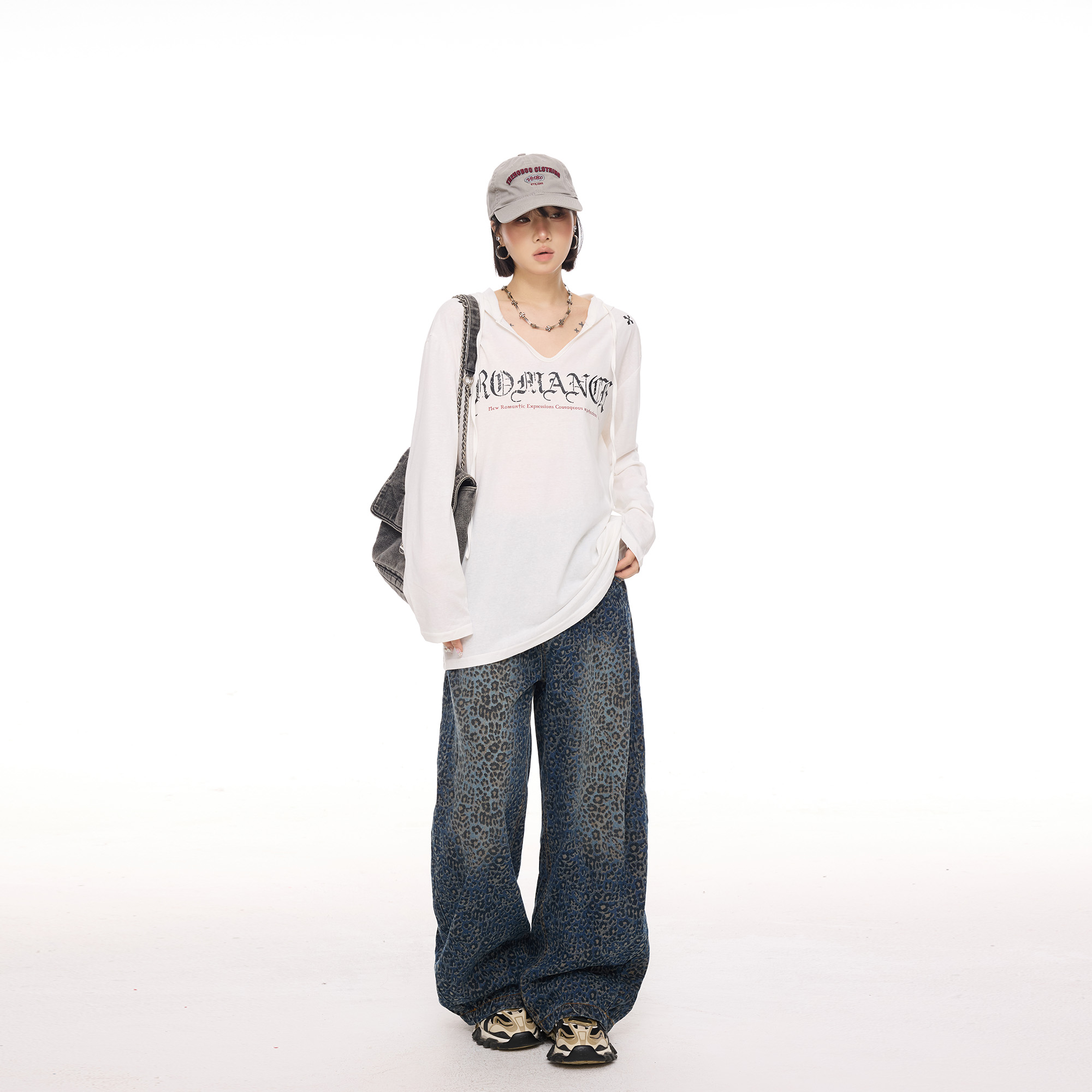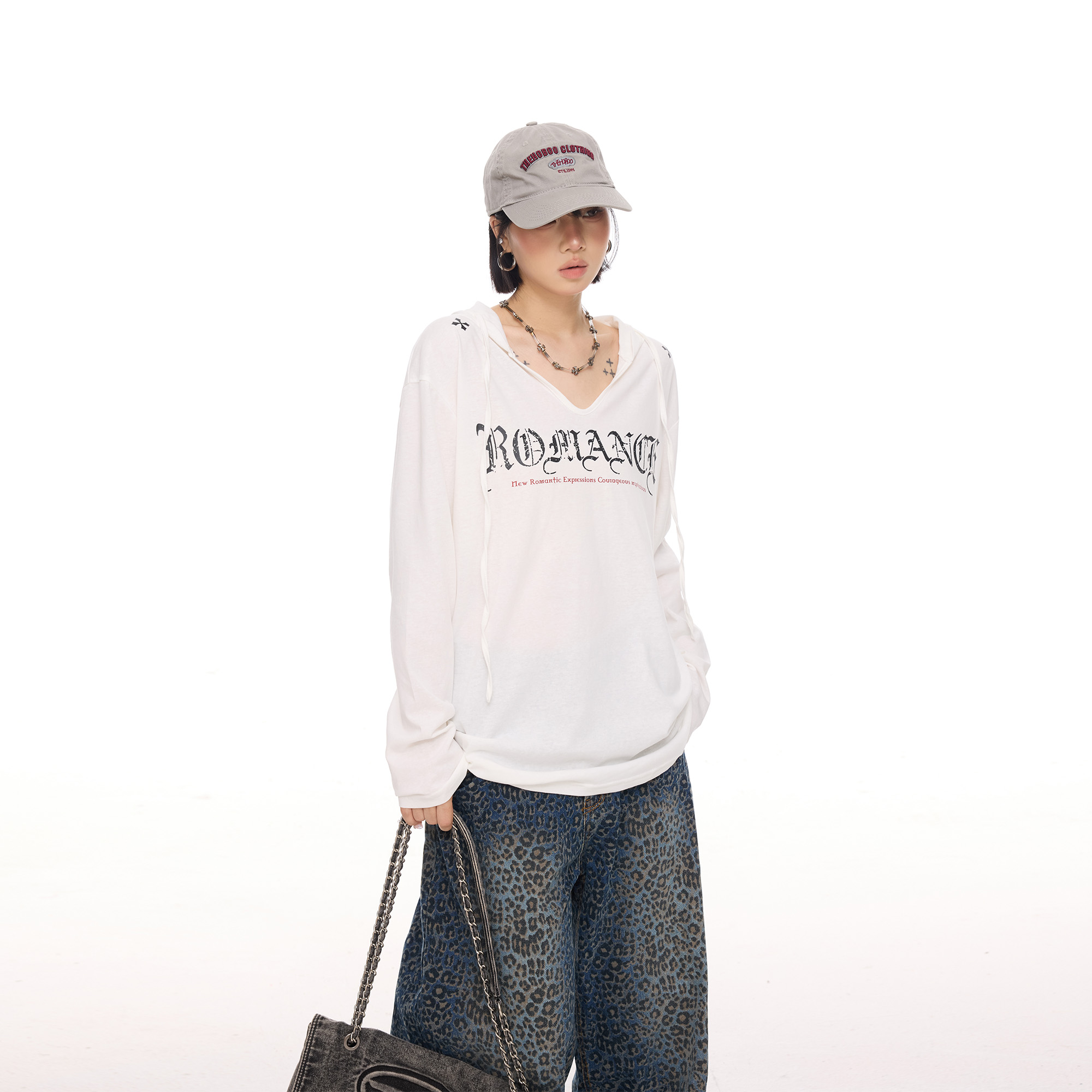 宽松微透空调罩衫 T恤女春秋新款 上衣 复古字母印花V领连帽长袖 美式