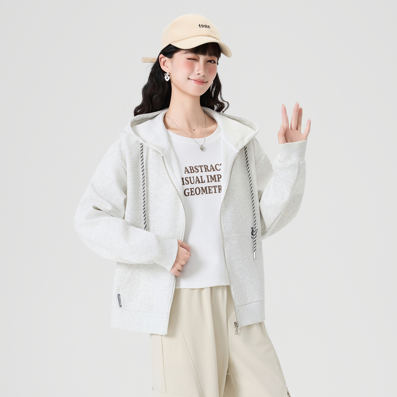 秋冬新款 开衫 修身 收腰上衣早秋穿搭美式 短款 灰色连帽卫衣外套女款