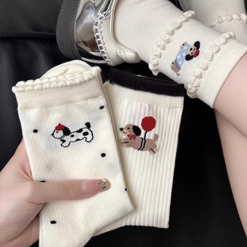 2025春秋可爱小狗白色袜子女学院风配jk中筒袜潮春秋百搭花边设计