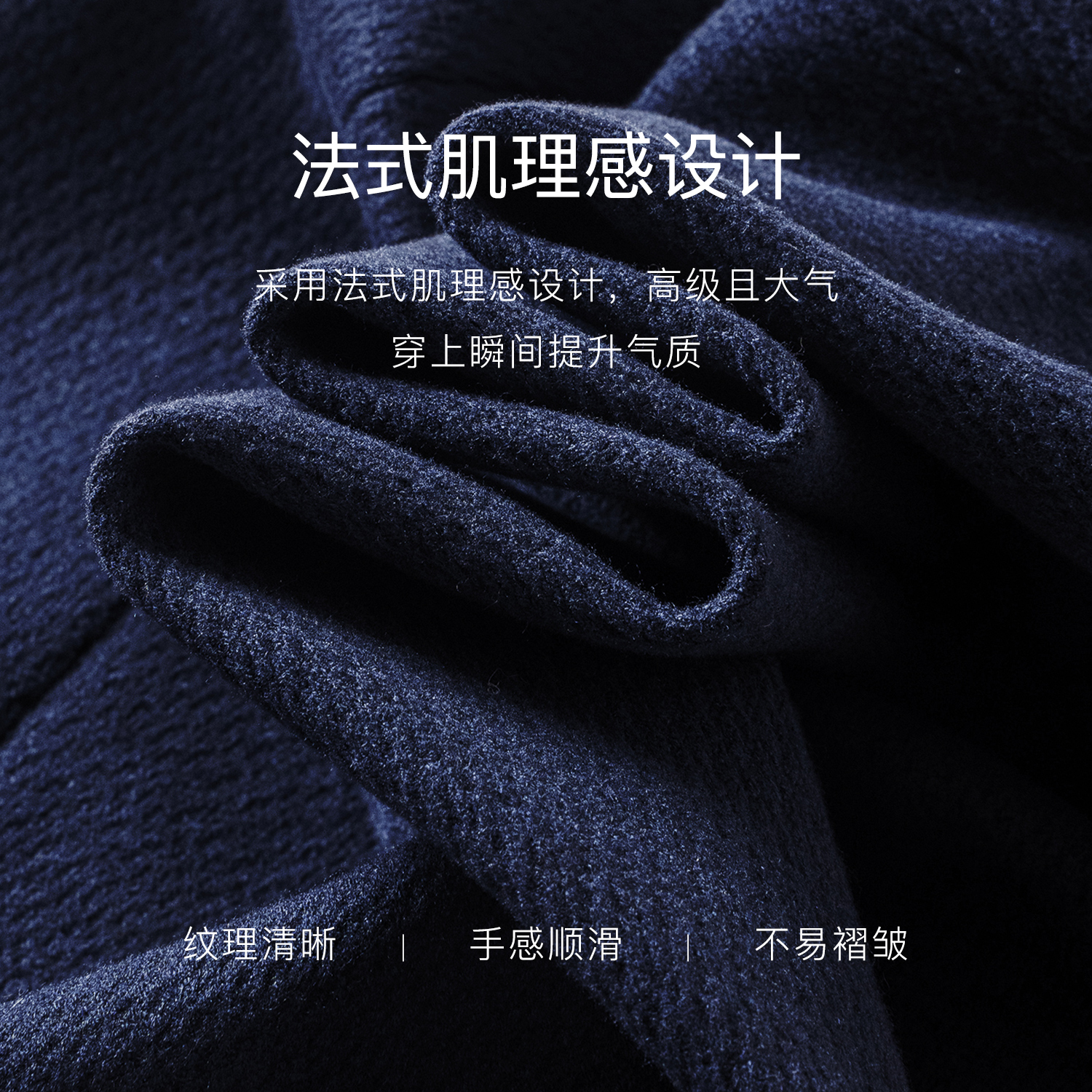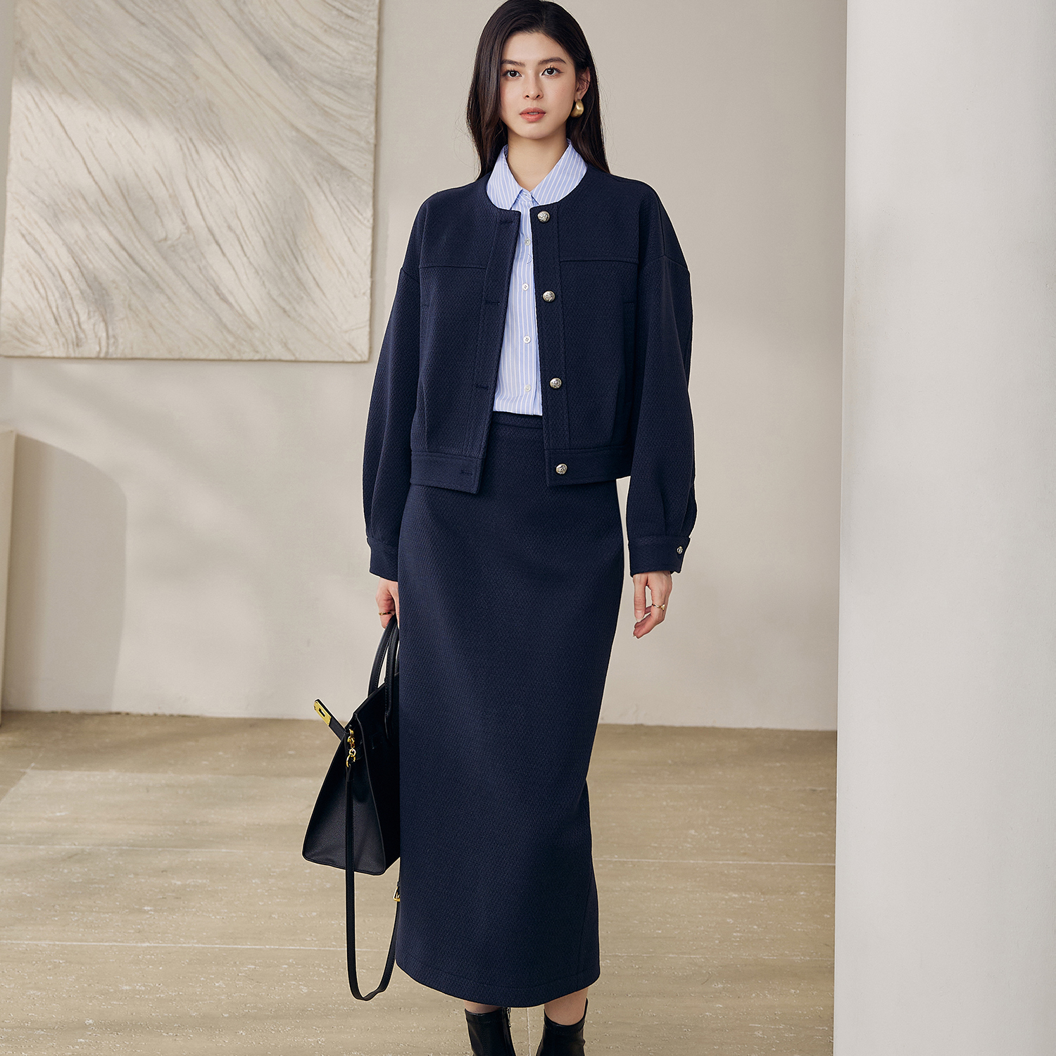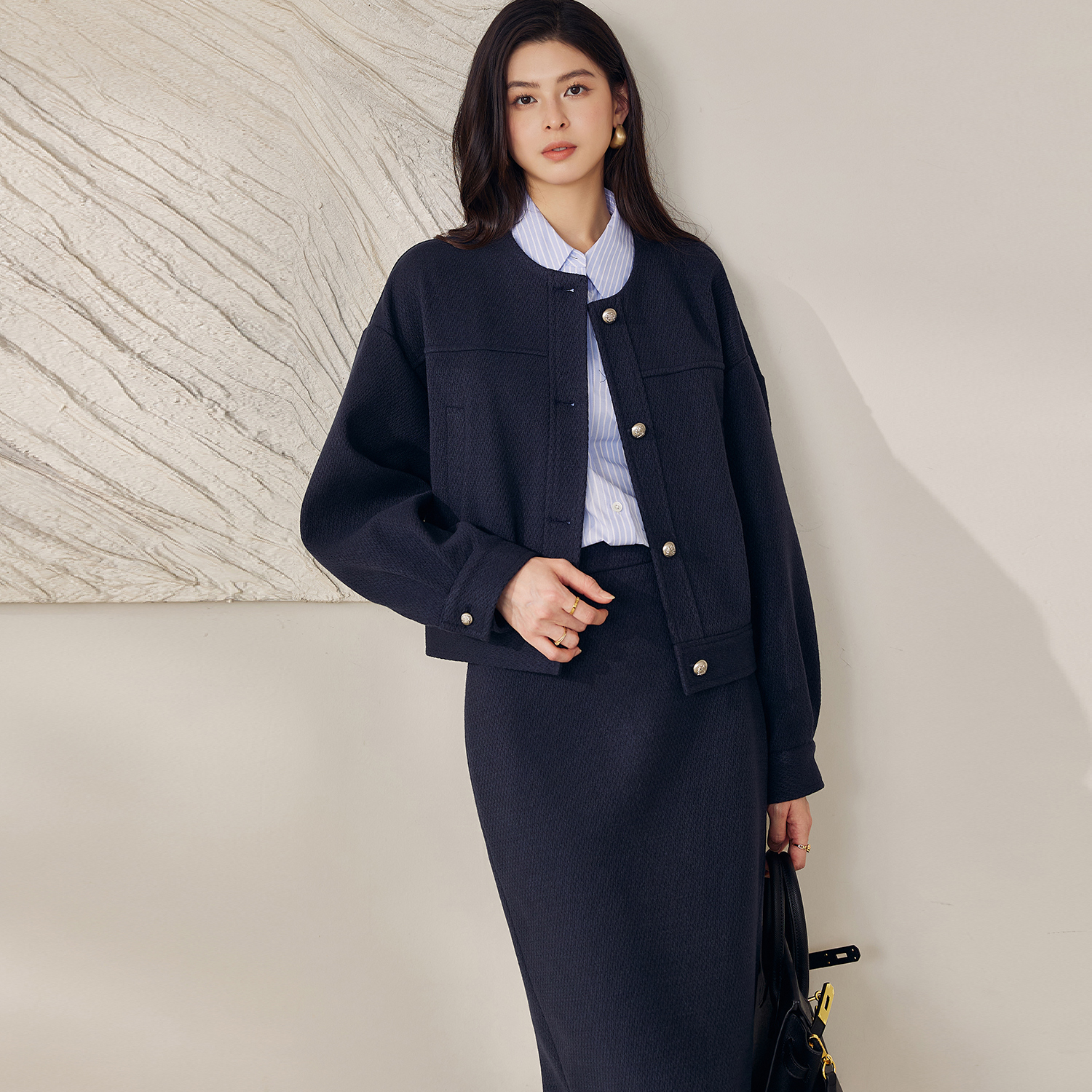 半身裙通勤两件套套裙12889 肌理短外套 罗衣知性深蓝纯色套装 法式