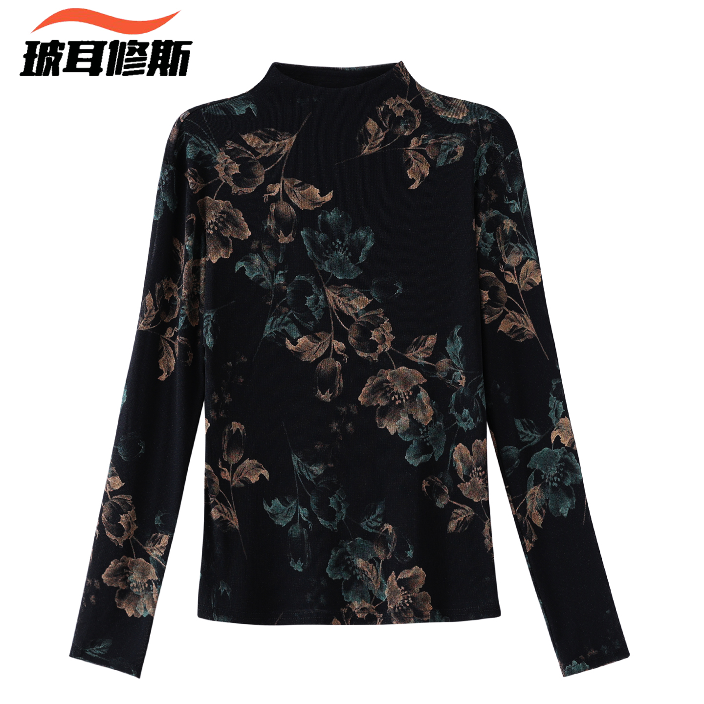半高领修身 秋冬新款 T恤洋气小衫 长袖 显瘦内搭上衣 印花网纱打底衫