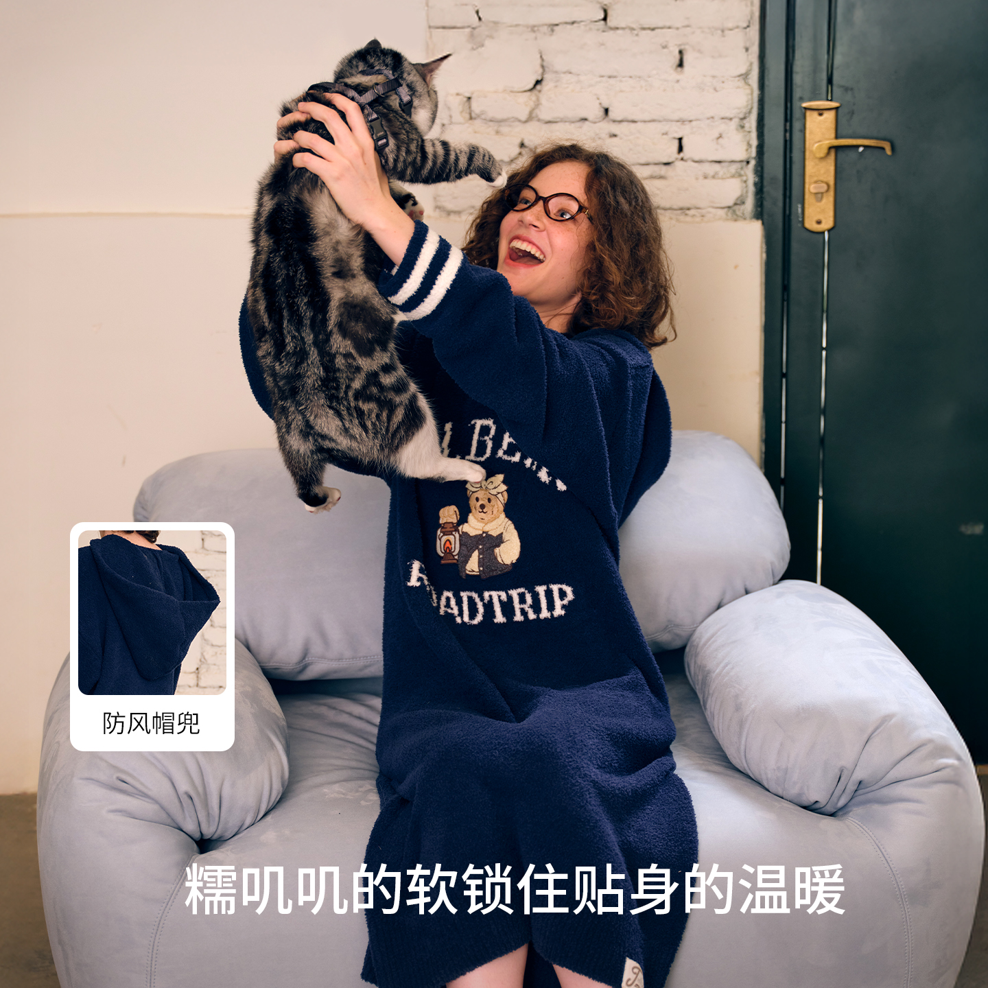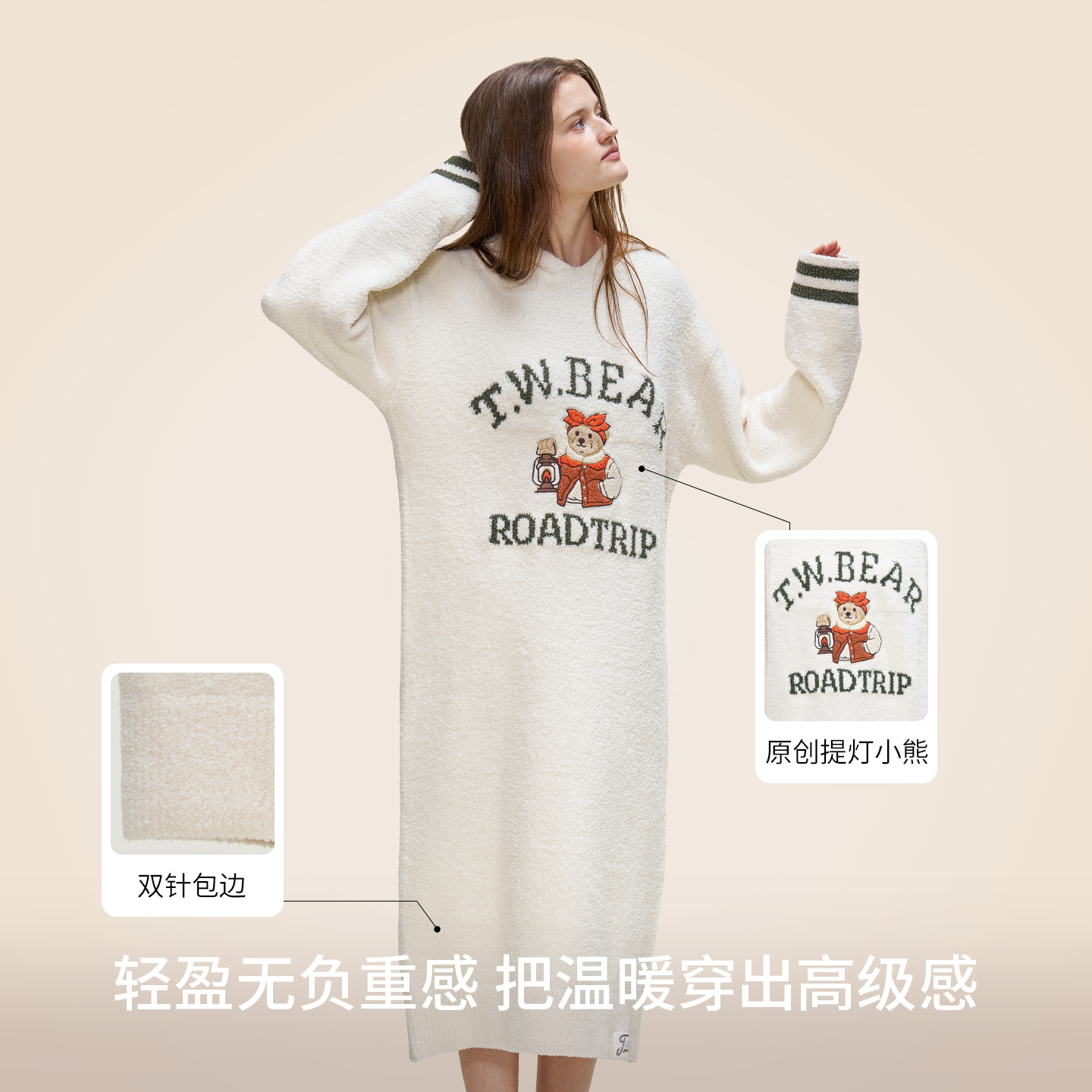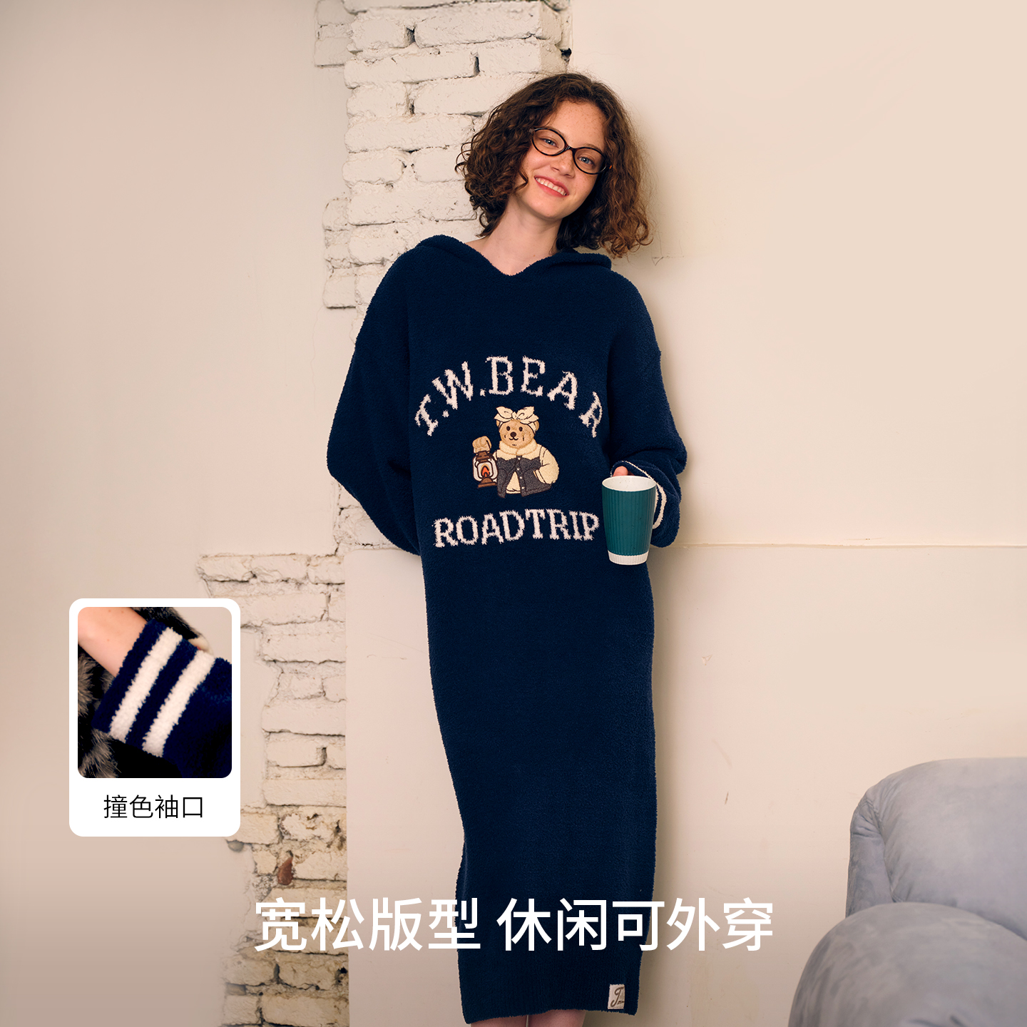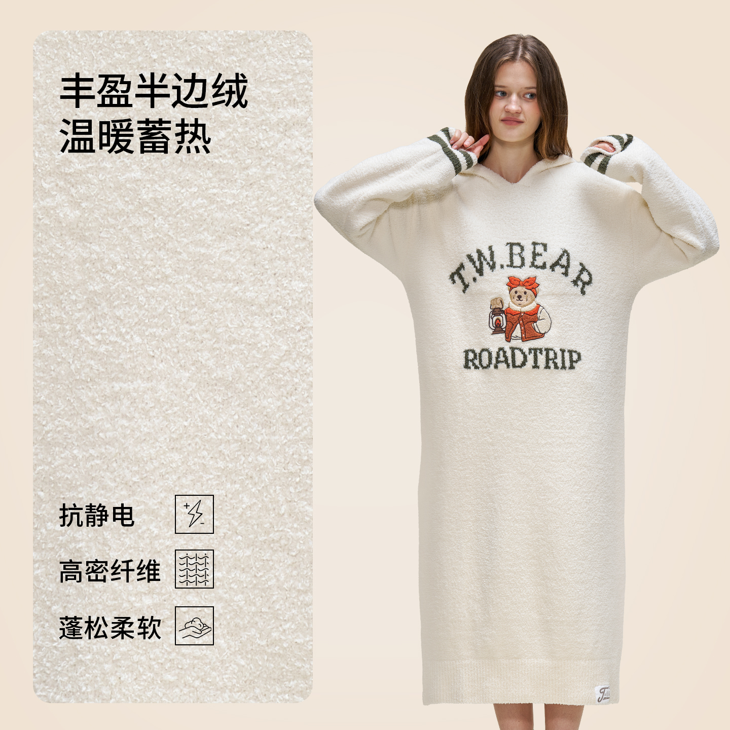 TeenieWeenie小熊秋冬半边绒戴帽睡裙睡衣可爱刺绣宽松加厚家居服