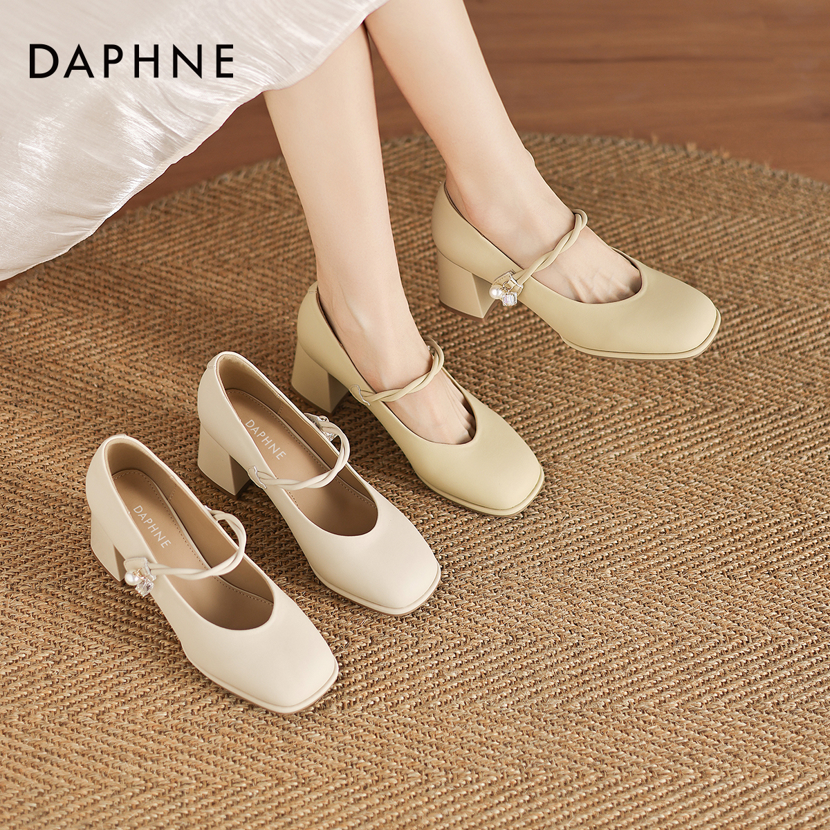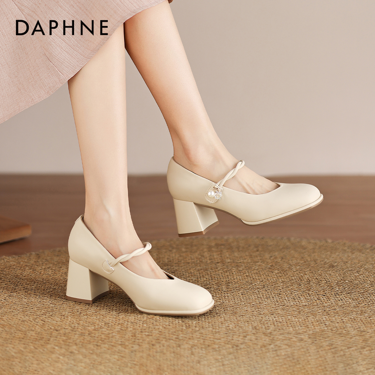 白色小皮鞋 秋季 浅口高跟鞋 粗跟法式 达芙妮玛丽珍女鞋 单鞋 2025新款