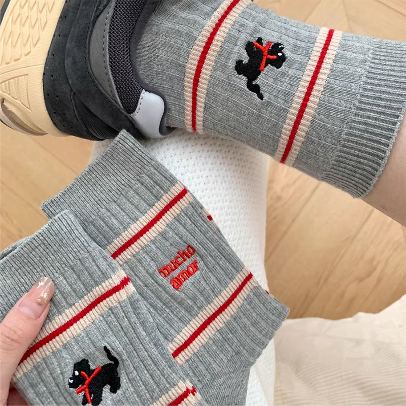 2025新款 黑色卡通可爱小狗拼色条纹中筒袜春秋百搭ins潮长袜 爆款