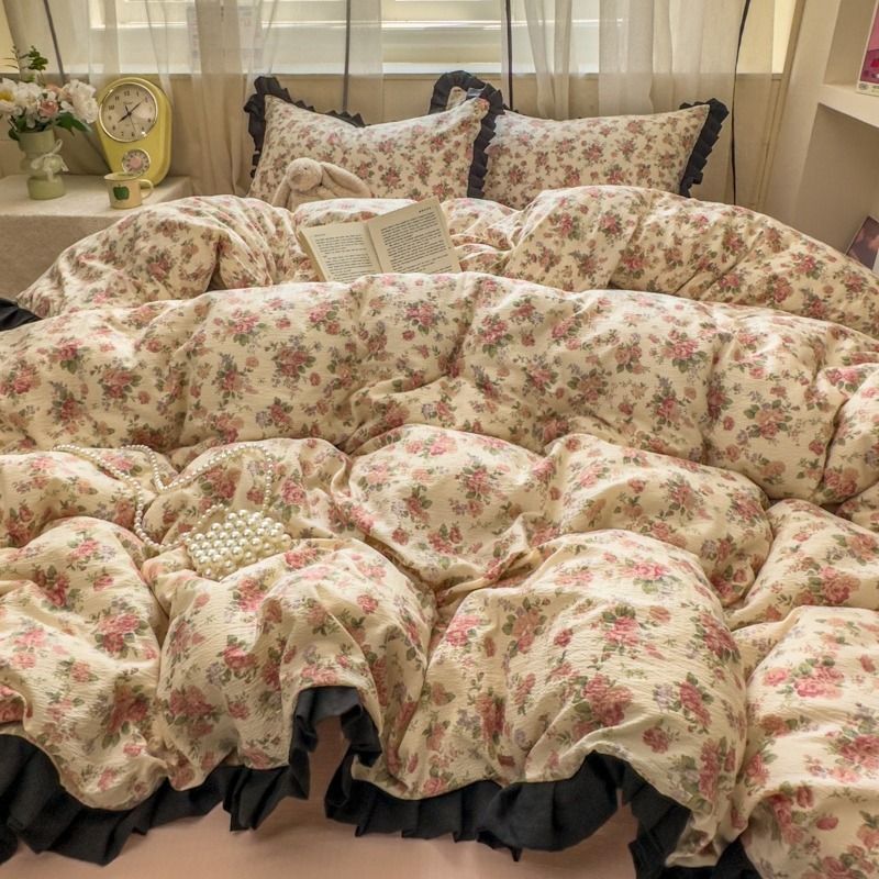 新款 超柔软双层纱赫本风花边四件套玫瑰花学生宿舍三件套床品套件