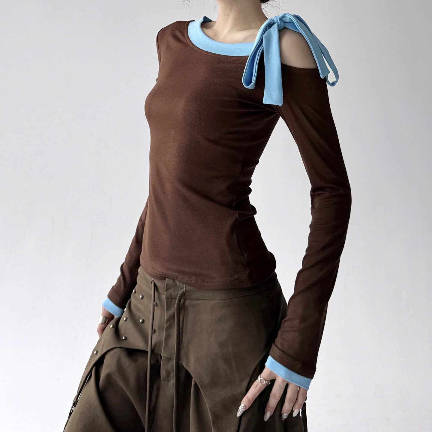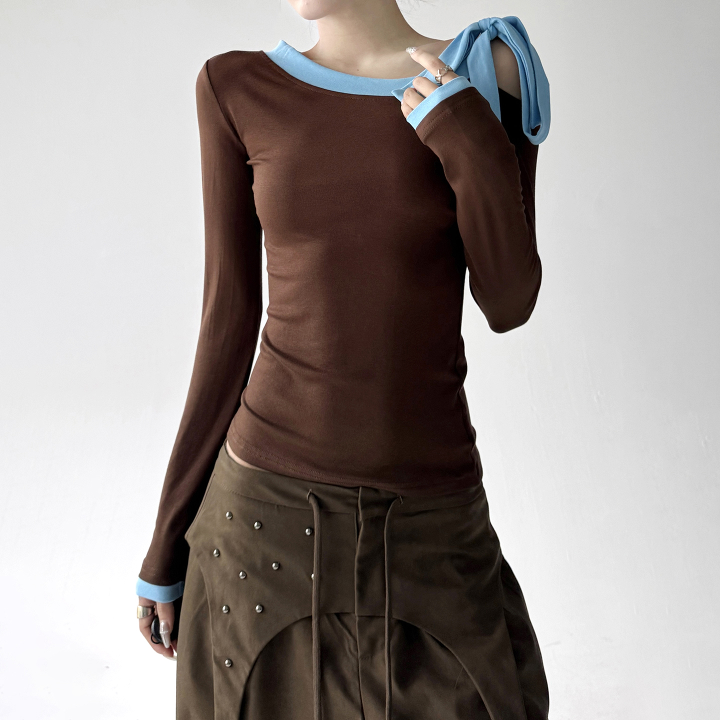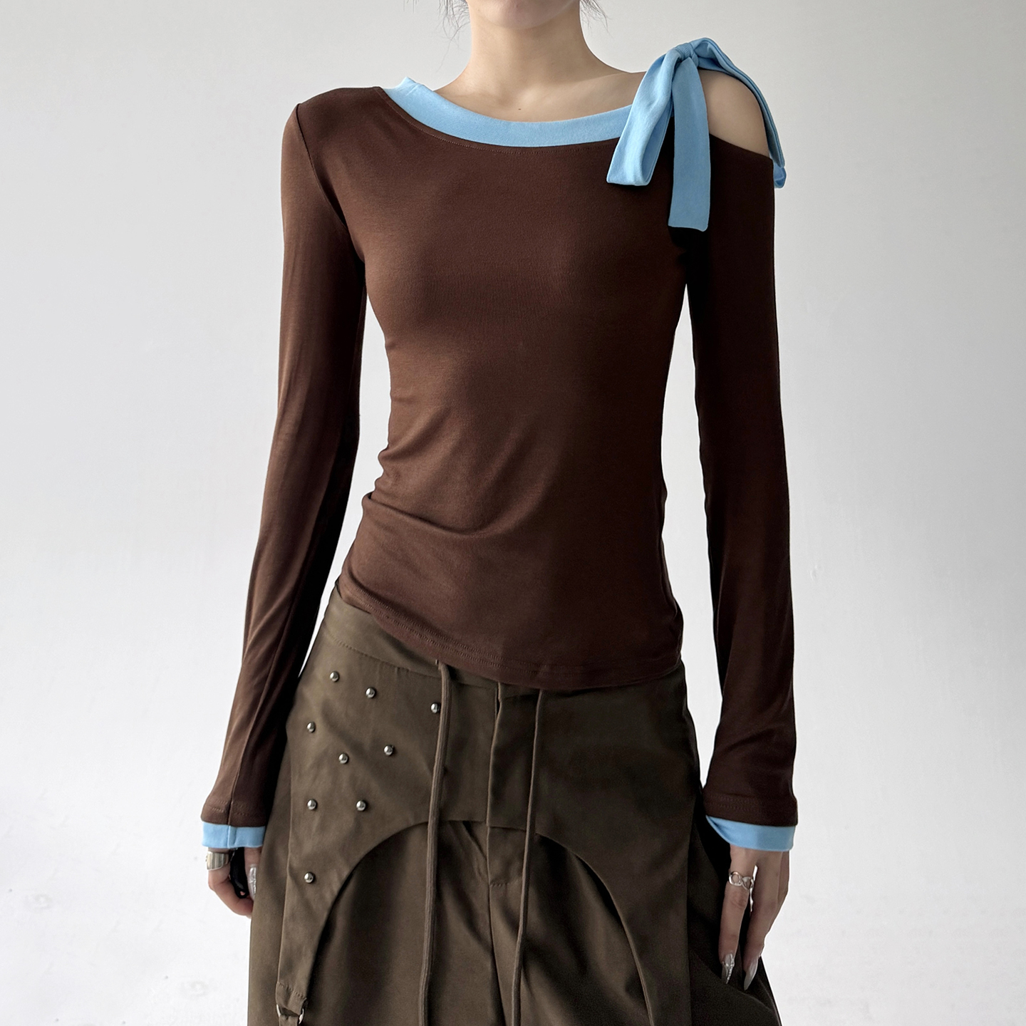 修身 新款 显瘦露肩上衣 T恤女2025超火秋装 纯欲风复古撞色斜肩长袖
