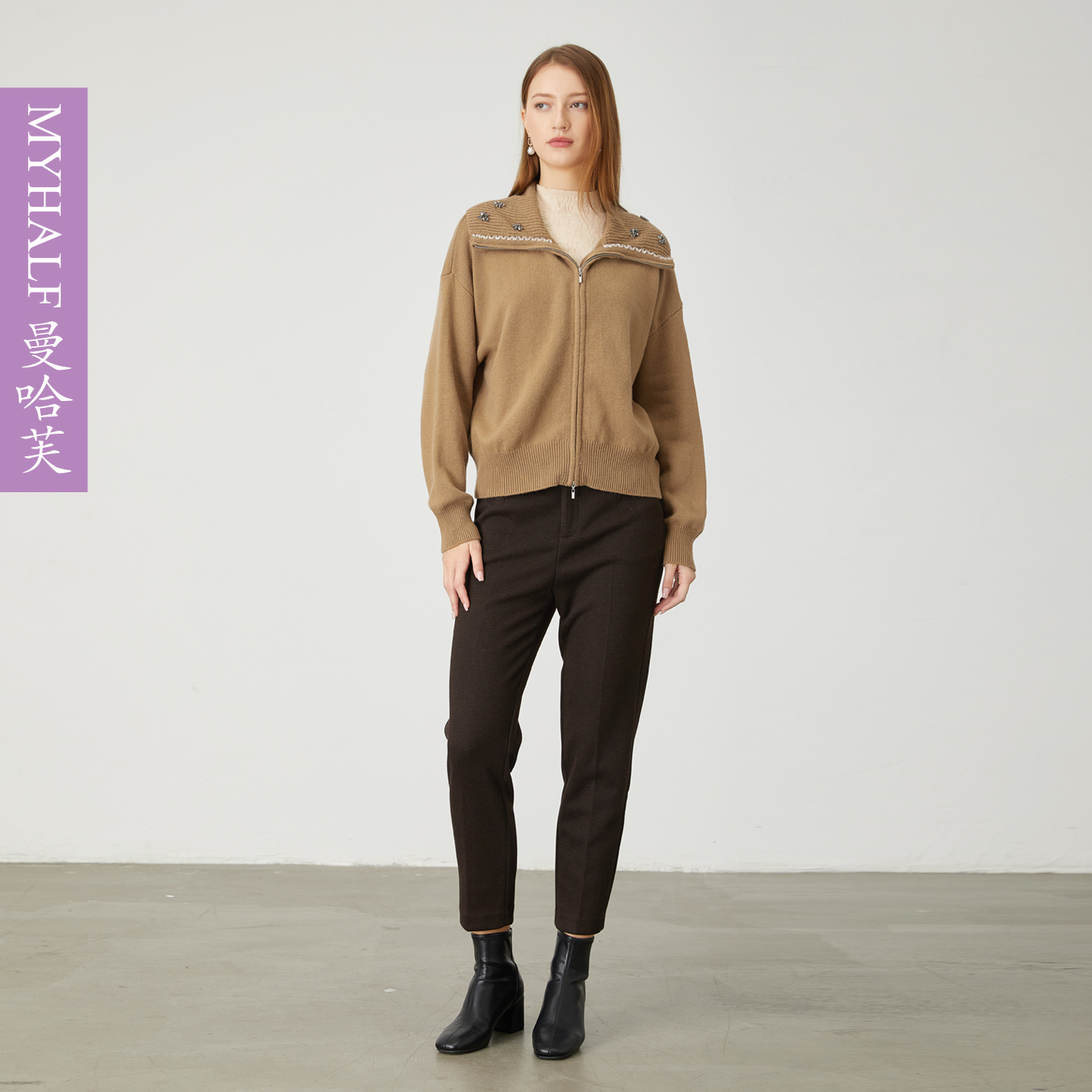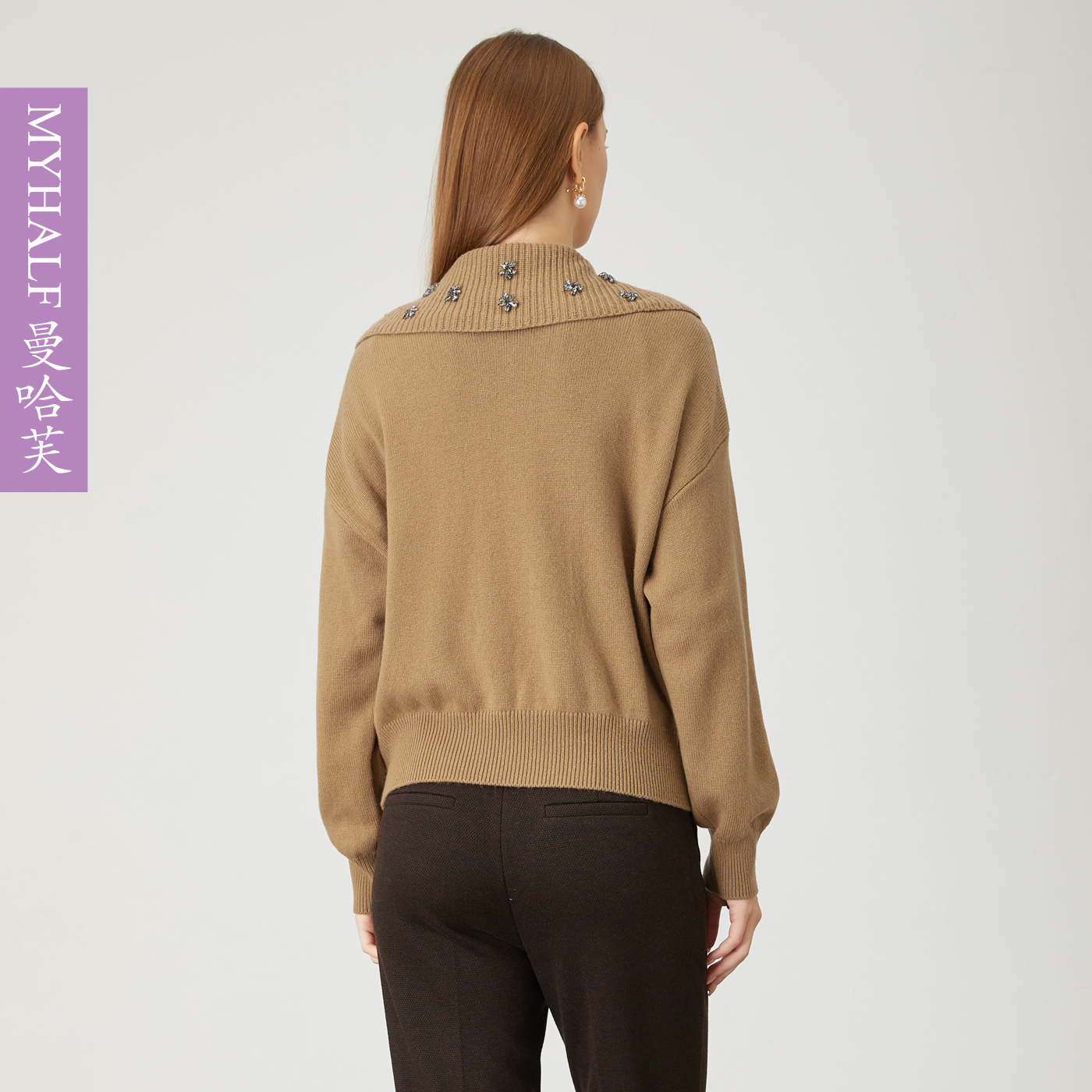 纯羊毛 毛衣针织开衫 曼哈芙秋新款 减龄温柔气质百搭镶钻披肩领短款