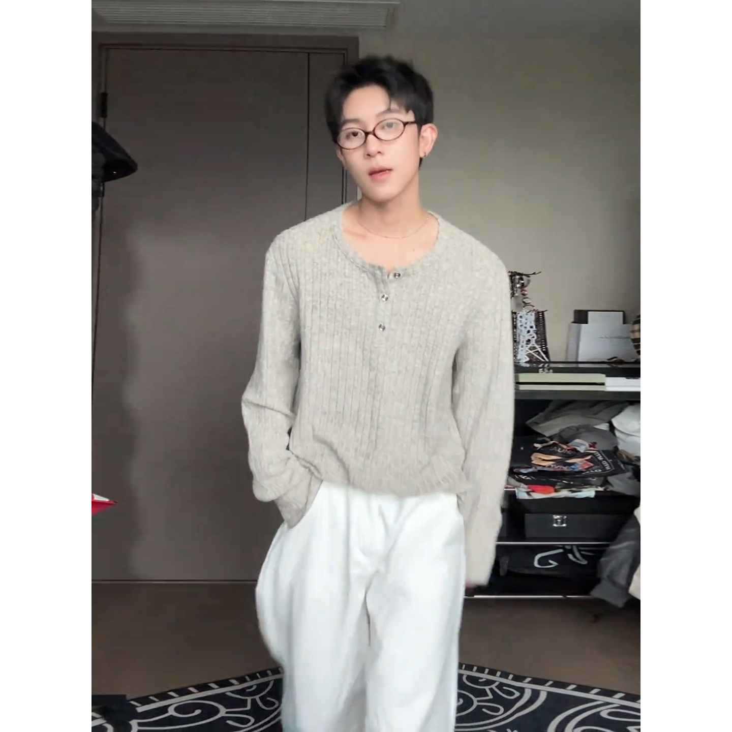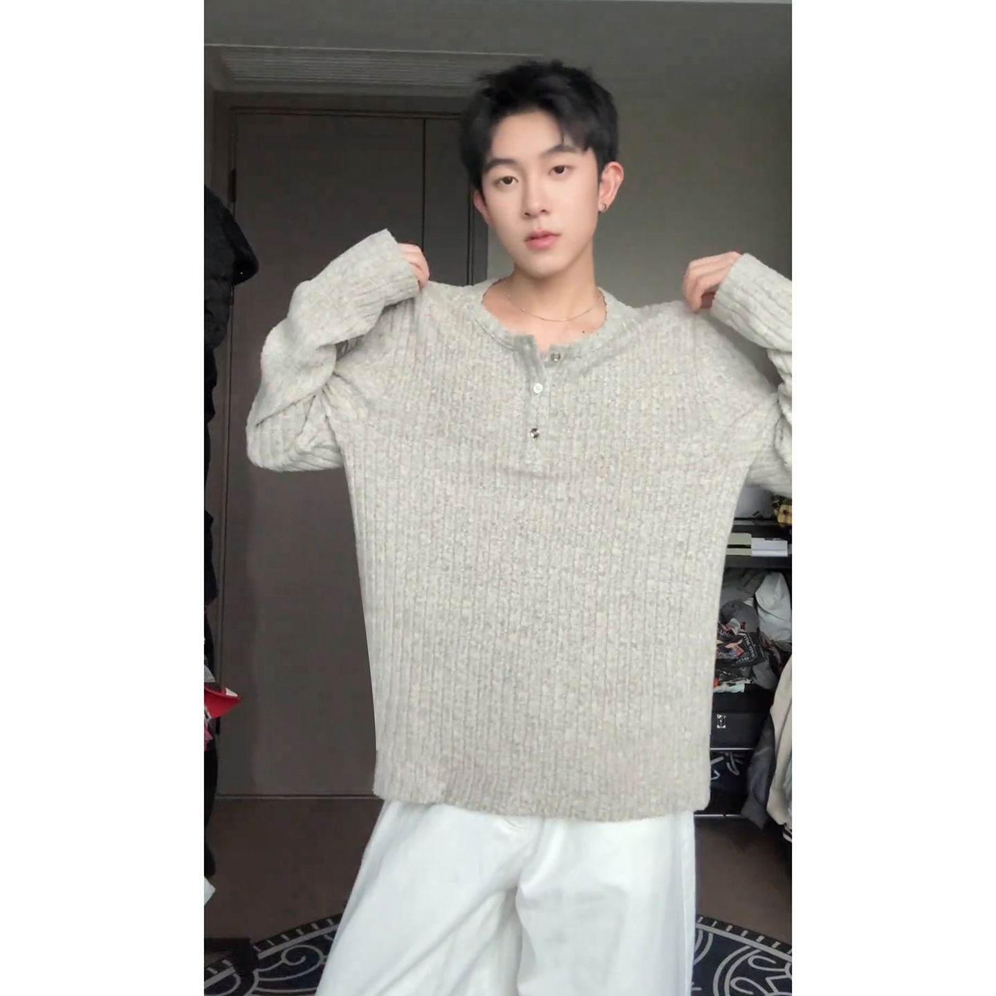 松弛感卫衣 cleanfit穿搭上衣美式 米色肌理感亨利领长袖 t恤男秋季