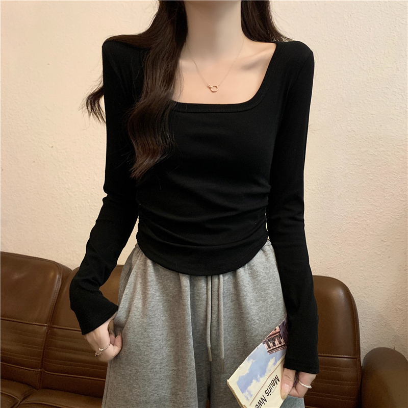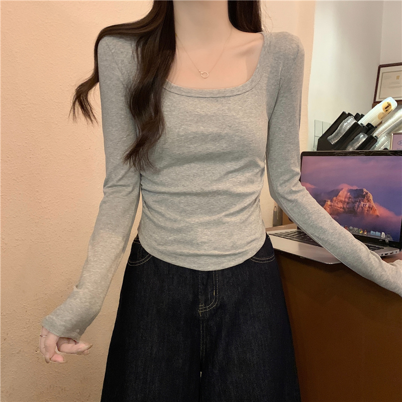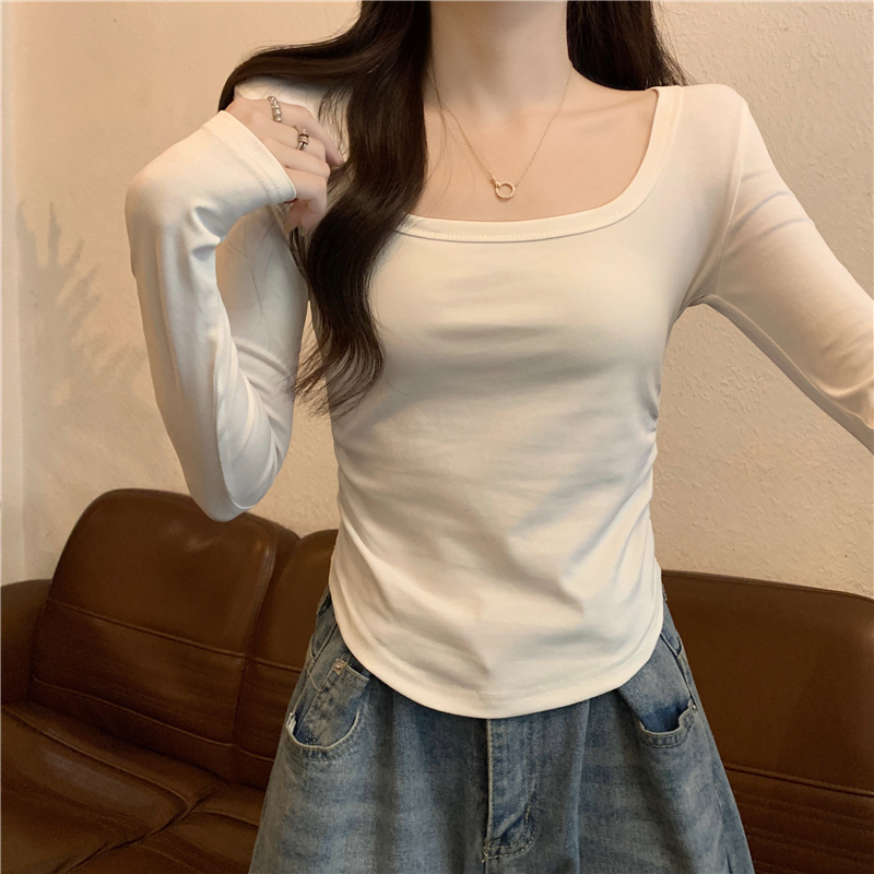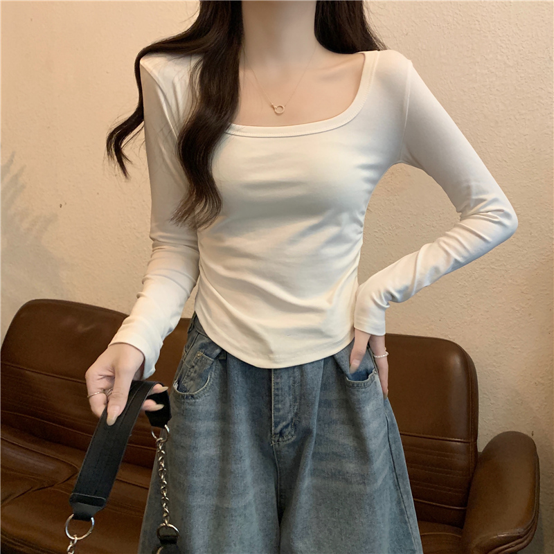 内搭打底衫 小个子短款 上衣 春秋修身 纯欲辣妹方领露锁骨t恤女长袖