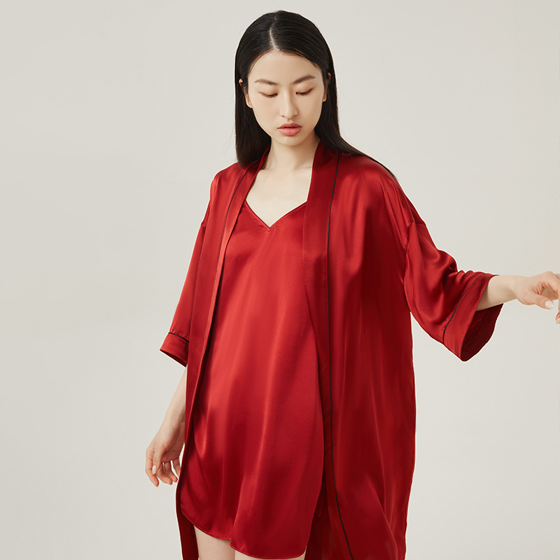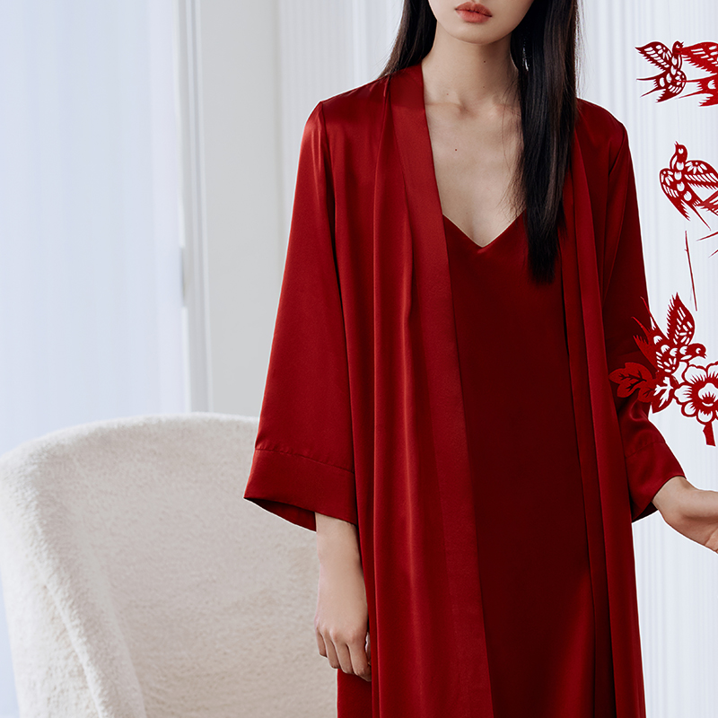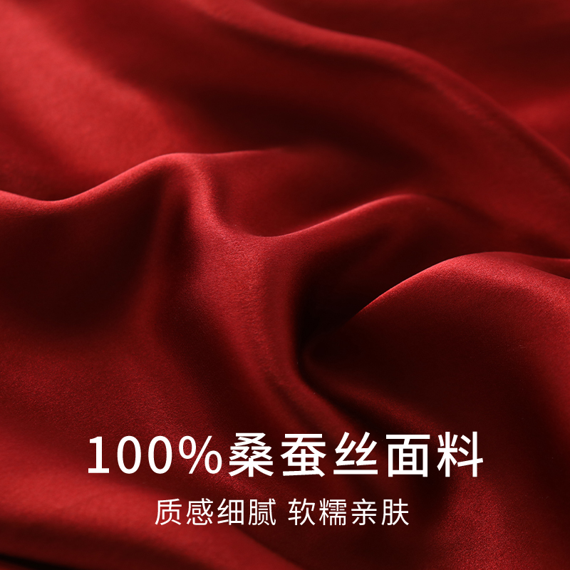 金三塔红色真丝睡袍女士新品 100%桑蚕丝婚礼晨袍本命年家居服睡衣