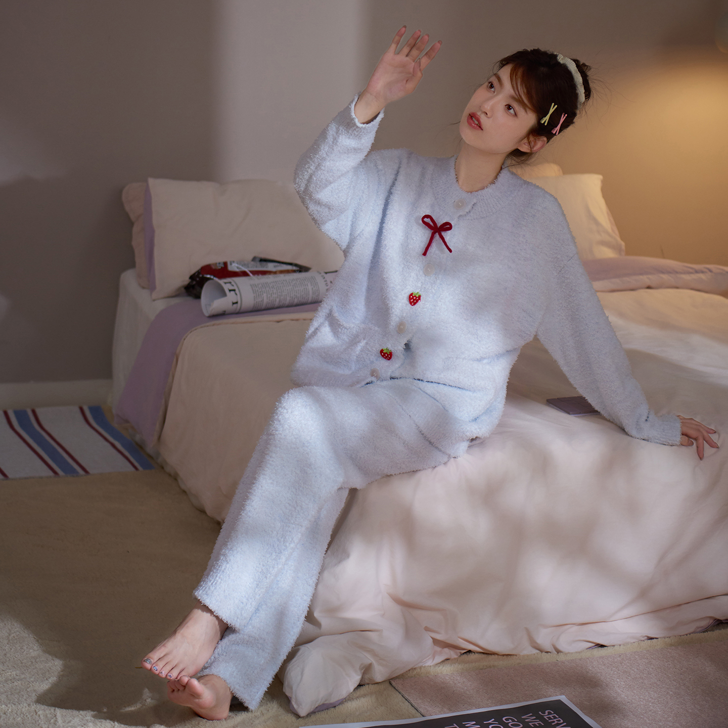马克公主半边绒开衫 睡衣女秋冬甜美草莓加厚加绒防静电家居服套装
