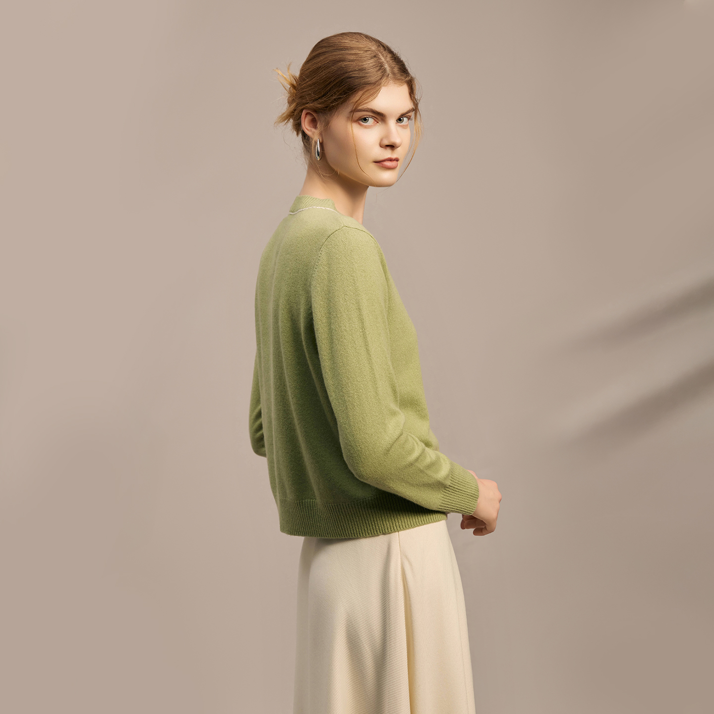 女士针织羊绒开衫 春竹100%羊绒2025秋冬新款 百搭显瘦圆领撞色长袖