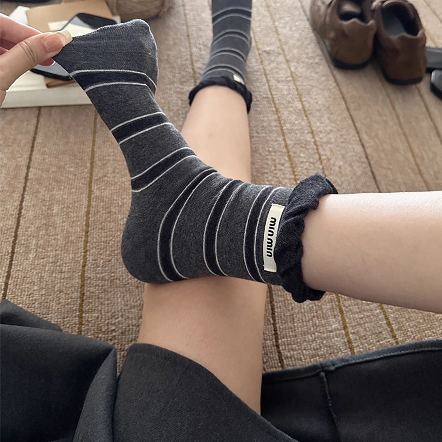 无骨条纹撞色双罗口布标字母ins潮袜韩系泡泡口棉质百搭中筒袜子