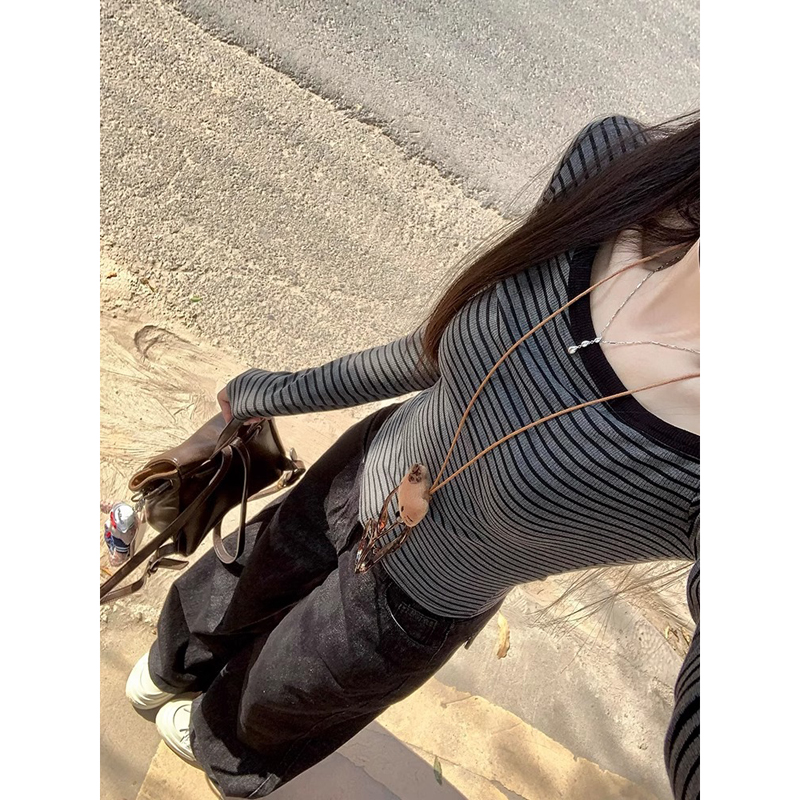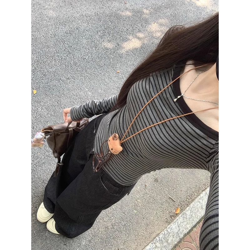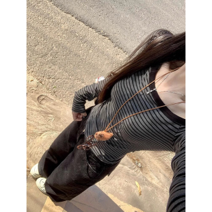 掐腰内搭打底衫 修身 上衣 早秋季 纯欲辣妹斜肩露锁骨条纹t恤女长袖