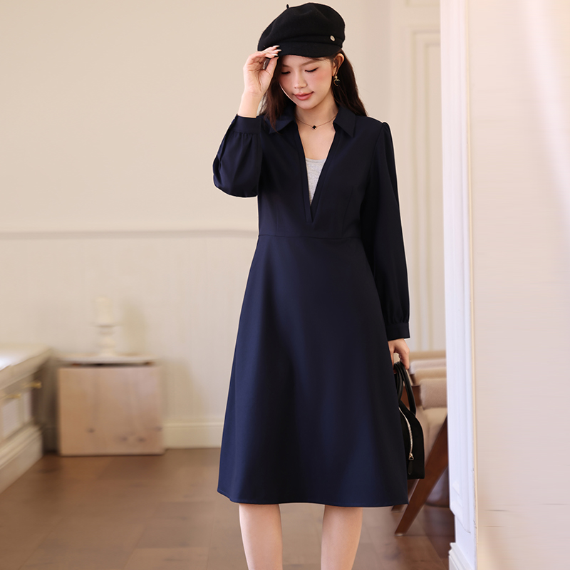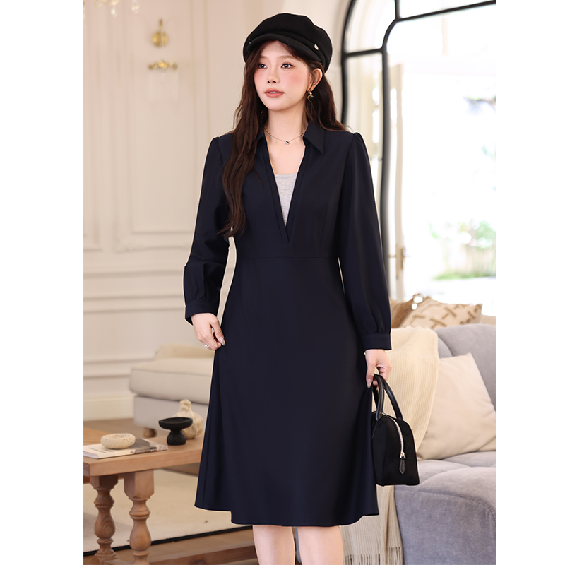 胖妹妹收腰长款 V领气质显瘦大码 过膝盖假两件连衣裙 新款 绮娑秋装