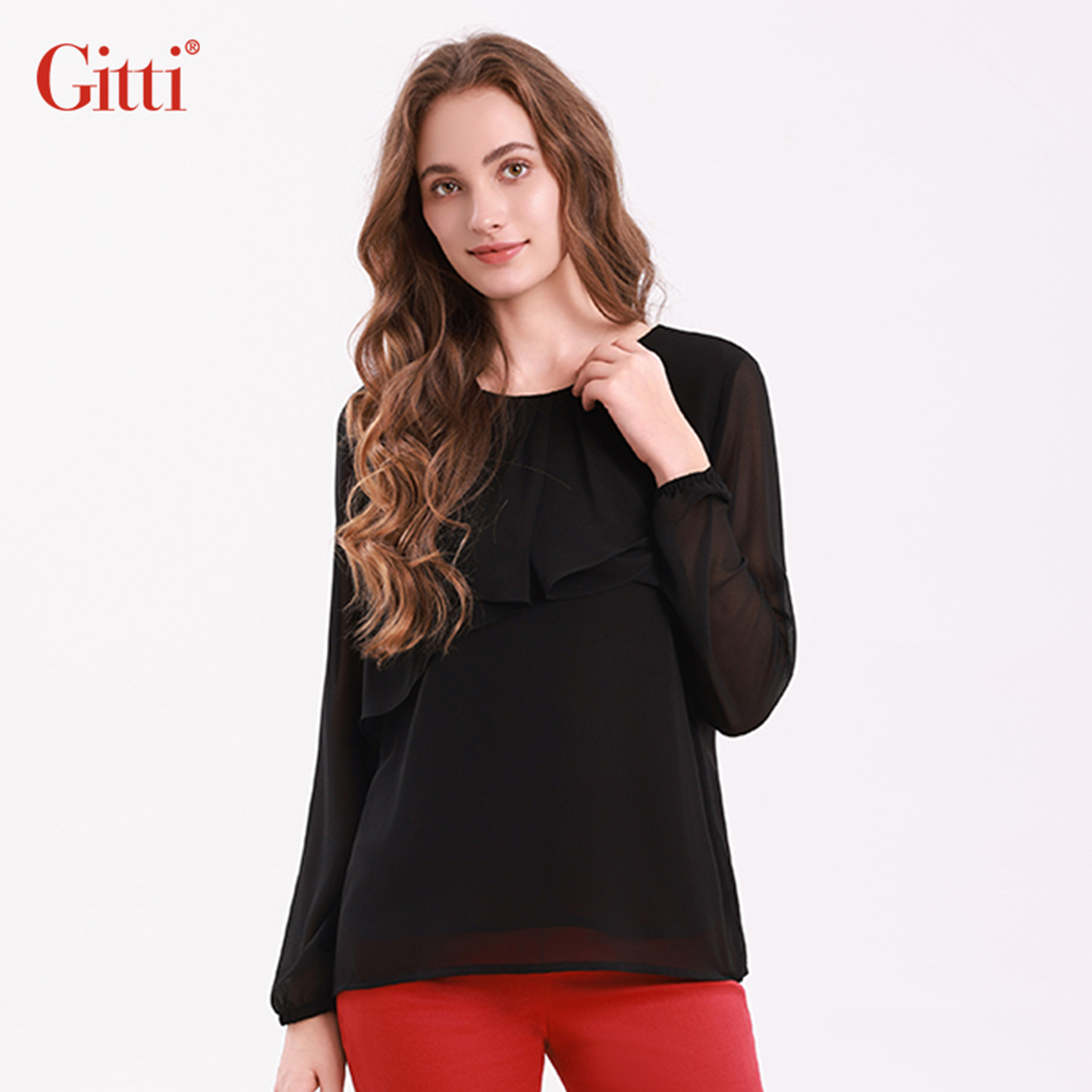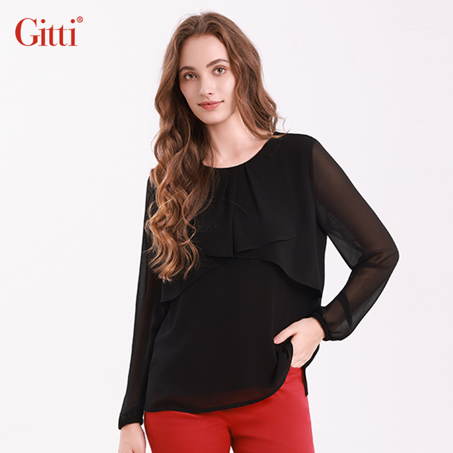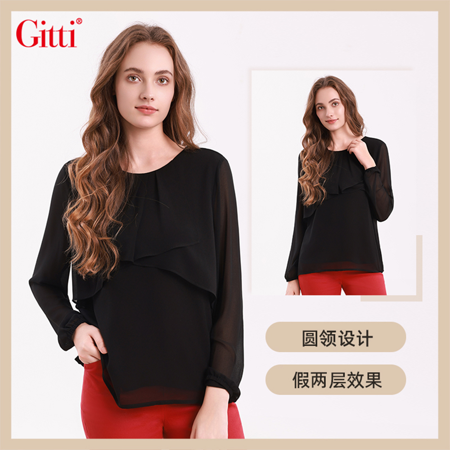 上衣G255152 女显瘦圆领大码 Gitti 吉蒂假两件花边拼接雪纺衫