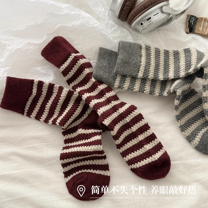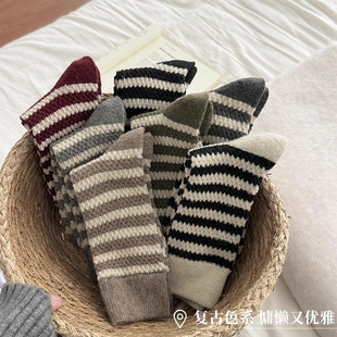 条纹袜子女秋冬中筒袜加厚保暖纯棉长筒堆堆袜毛圈仿羊毛袜雪地靴