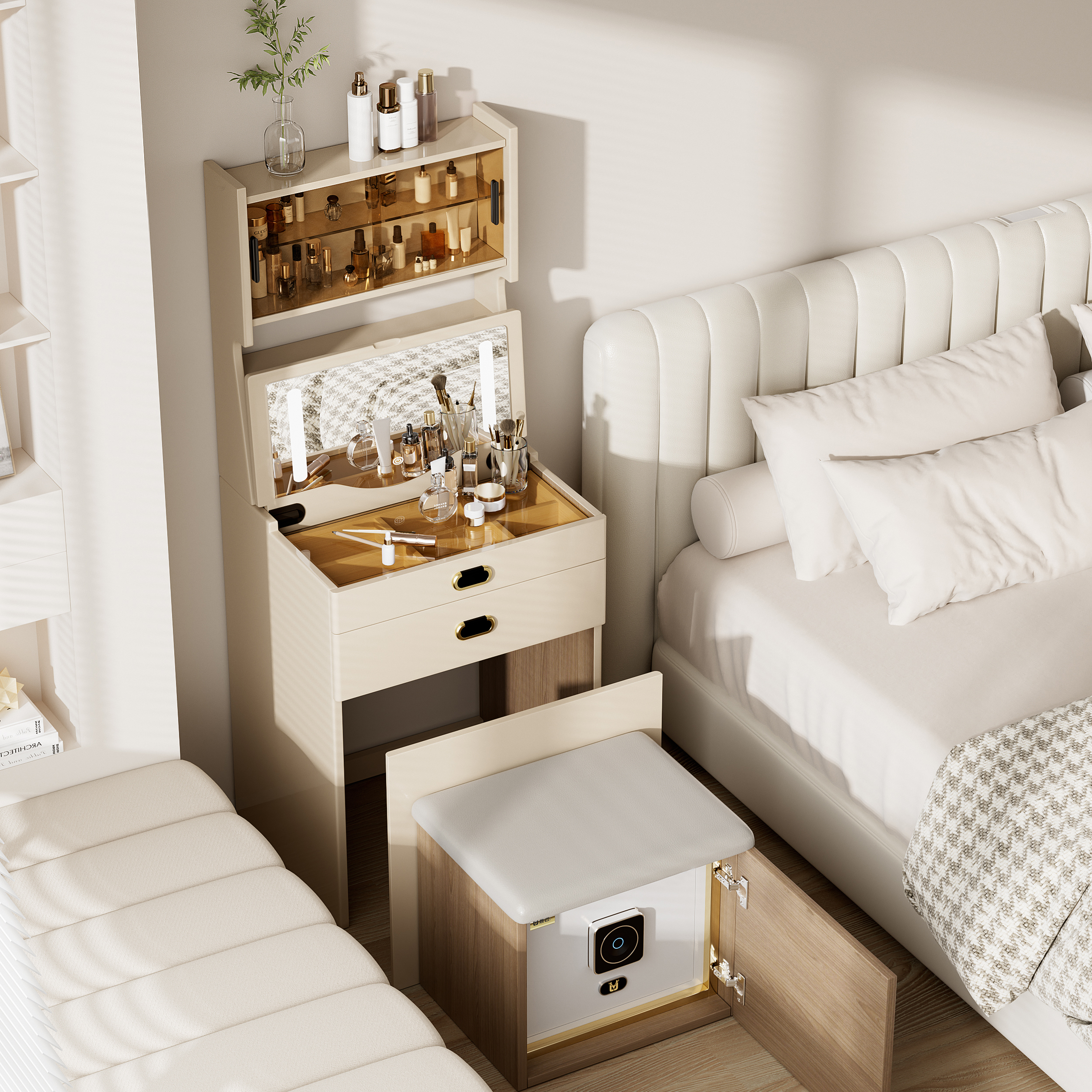 指纹wifi防盗保险柜智能梳妆台 轻奢高级感隐藏式 虎牌智能梳妆柜保险箱家用小型置物架抽屉式 卧室床头柜一体式