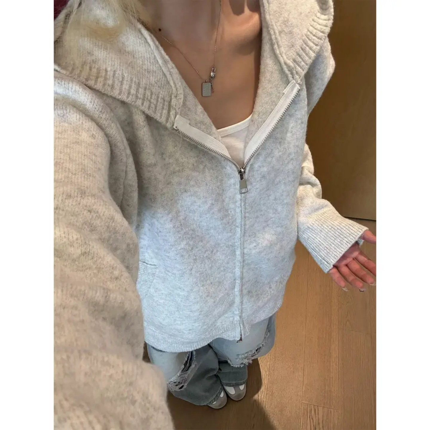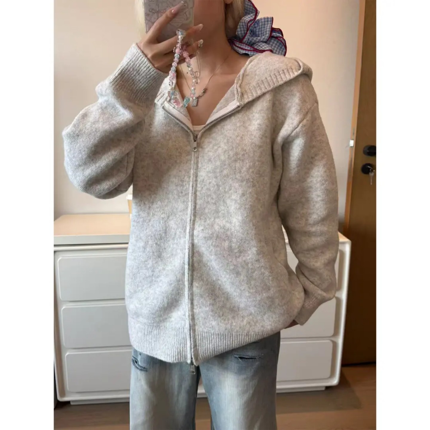 卫衣cleanfit情侣外套 慵懒风针织开衫 浅灰色拉链连帽毛衣男款 秋季