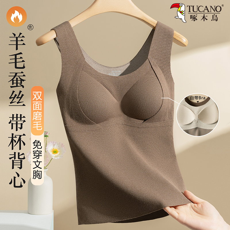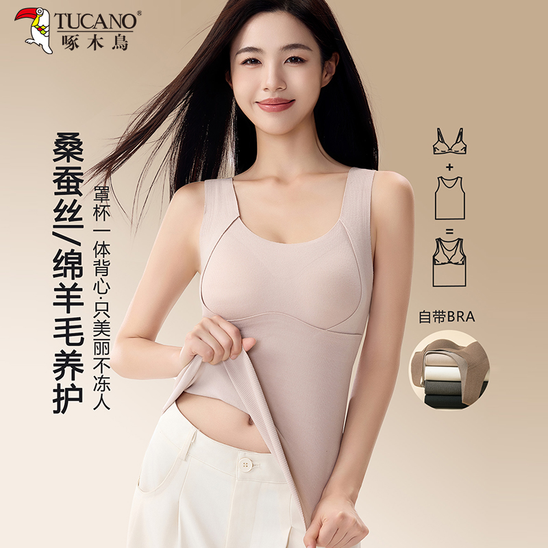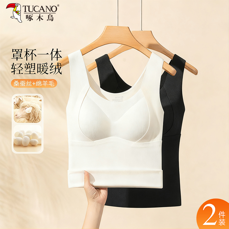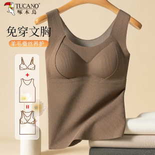 桑蚕丝保暖吊带背心女2025秋加绒加厚发热无痕自带胸垫一体内衣冬