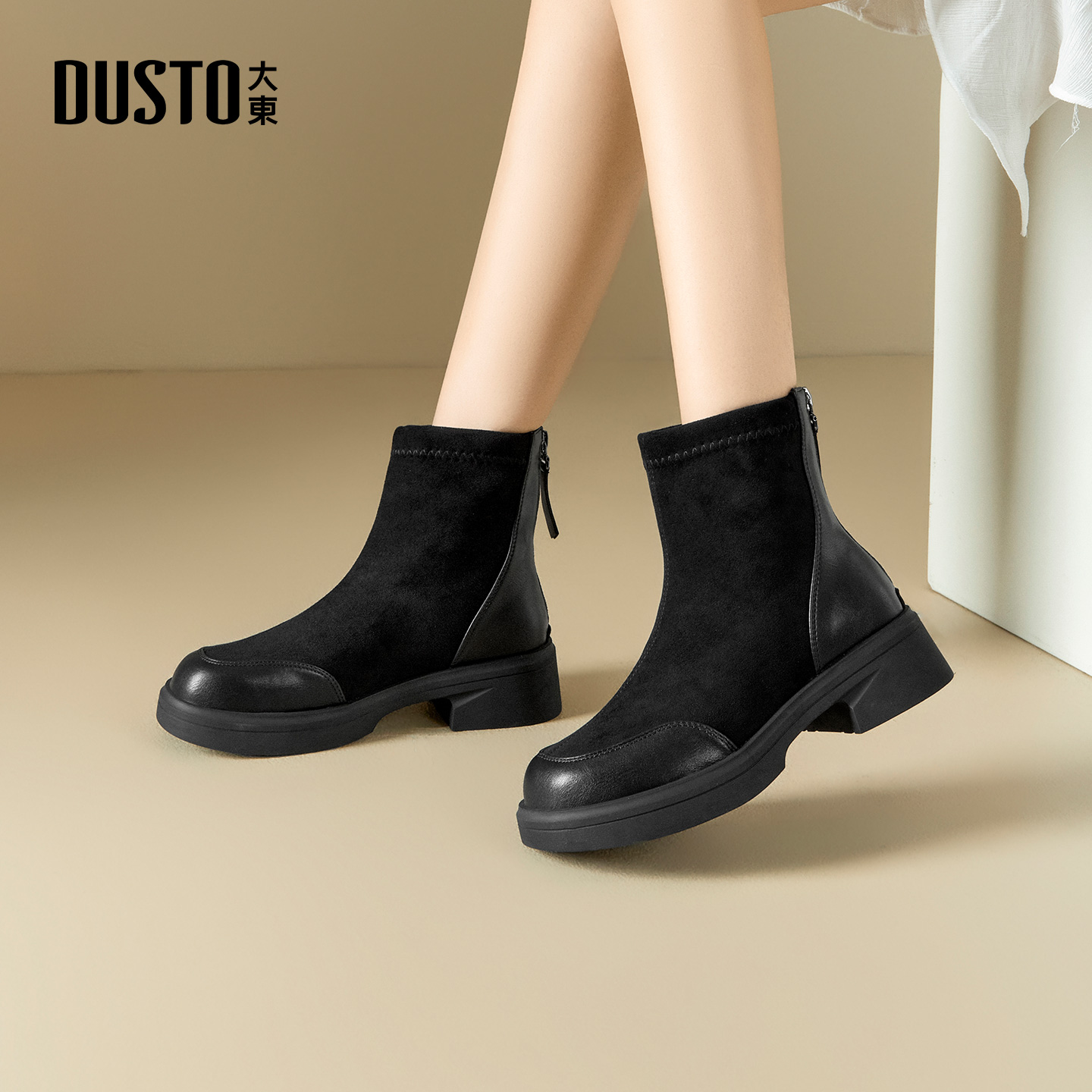 大东黑色厚底短靴女2025新款 靴子弹力瘦瘦靴绒面袜靴春秋单靴 秋季