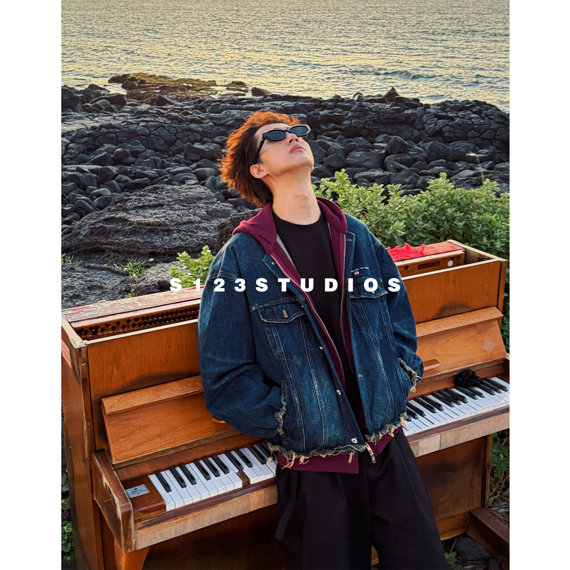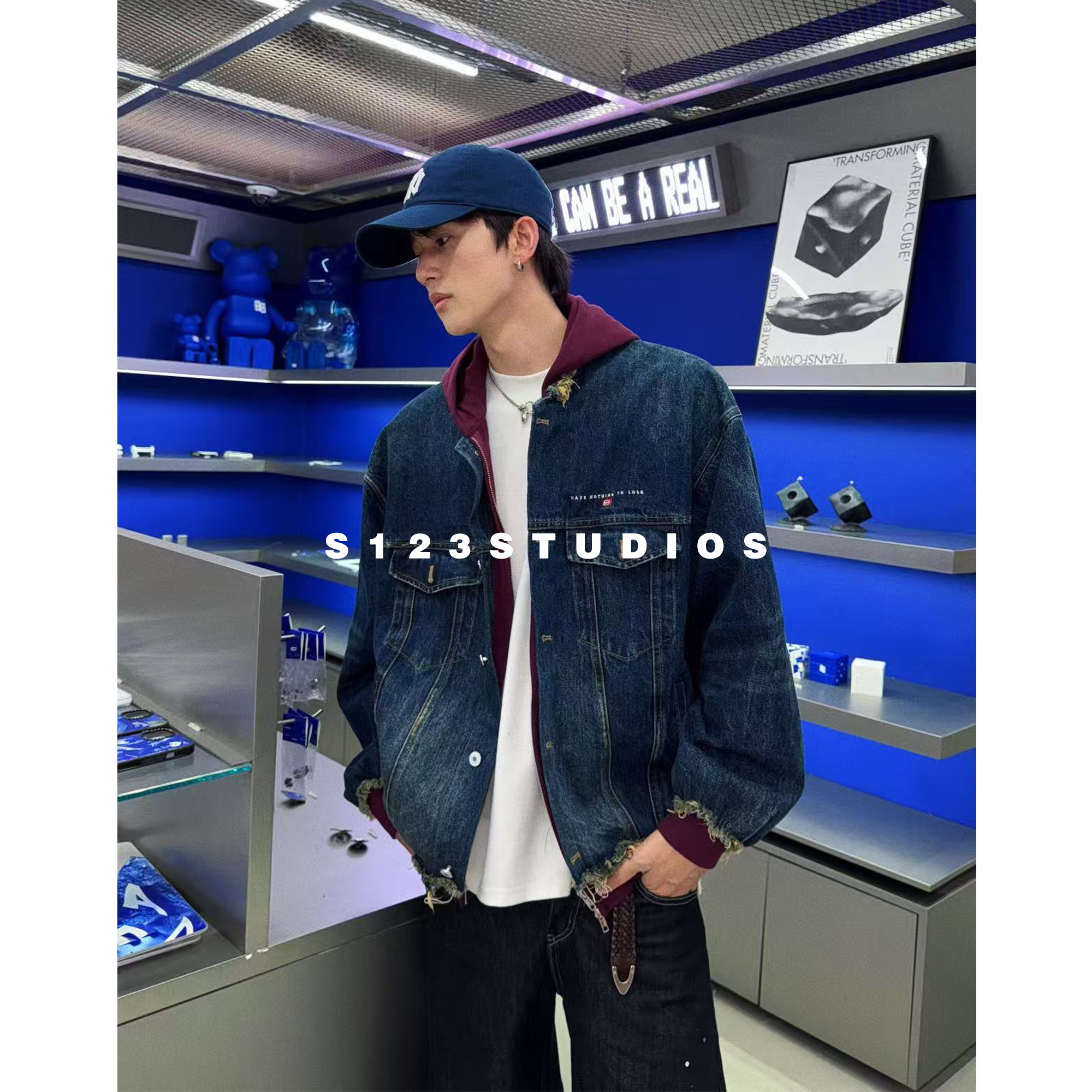 s123巴家假两件拼接撞色连帽牛仔夹克秋冬高街痞帅字母情侣外套