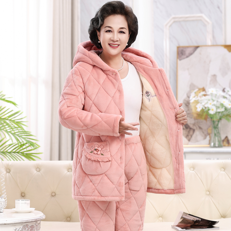 大码 春秋开衫 女士家居服 加厚珊瑚绒睡衣女冬法兰绒加绒套装 秋冬季