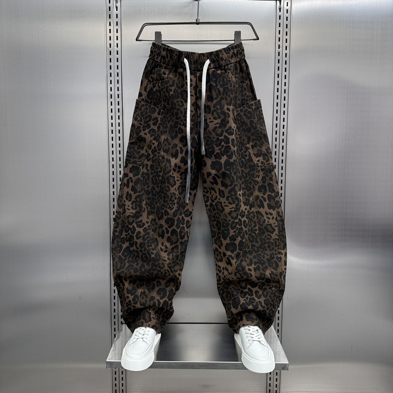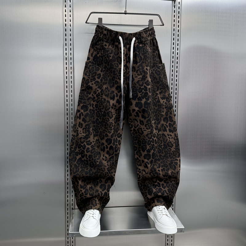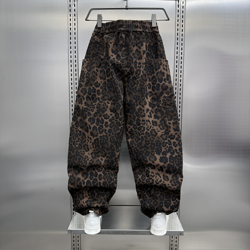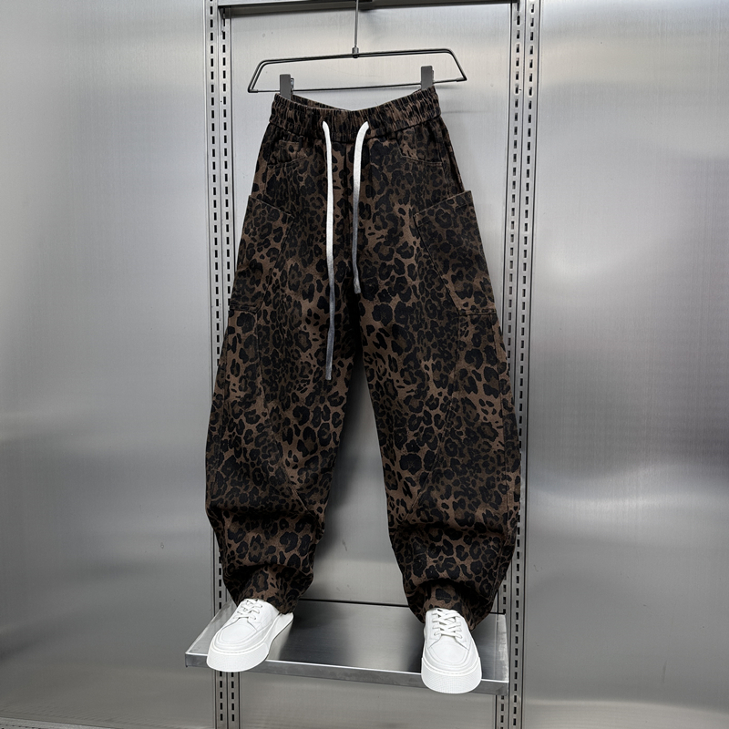 宽松阔腿弯刀裤 豹纹美式 时尚 拼接休闲痞帅工装 男裤 裤 春秋潮牌个性