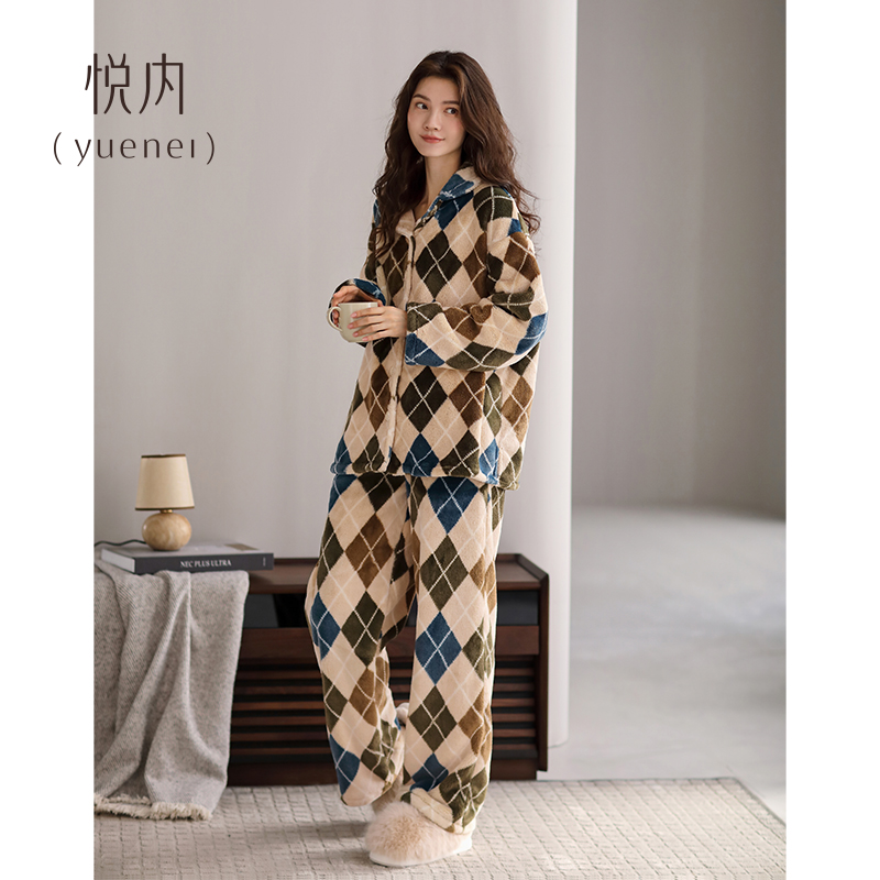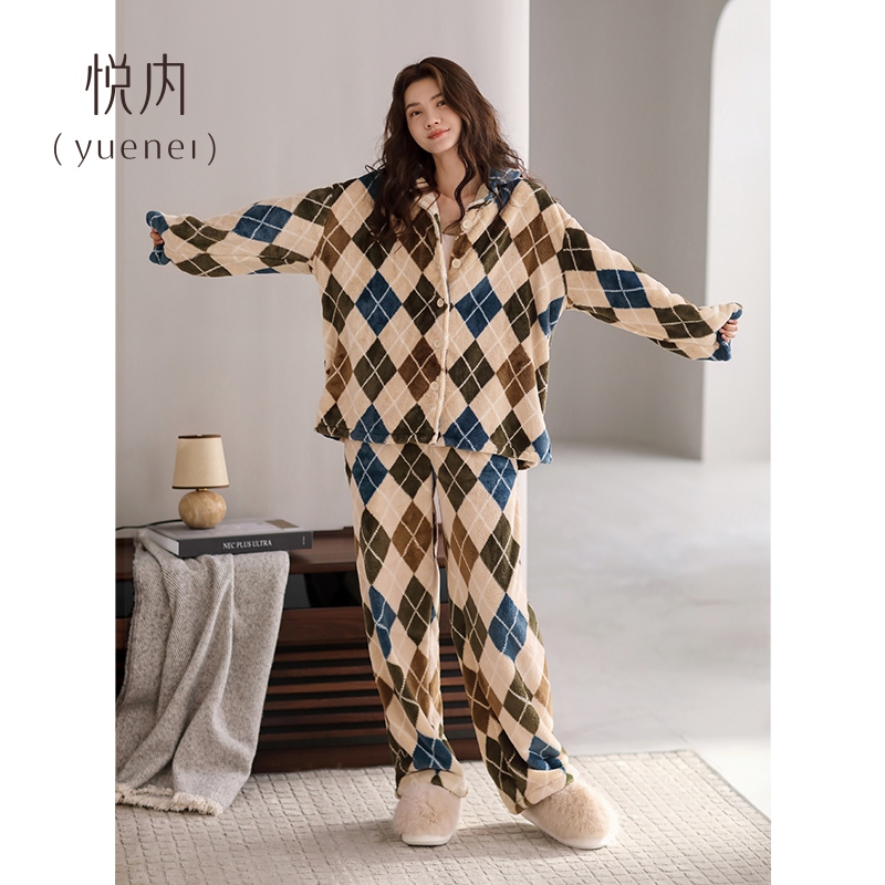 悦内睡衣女士秋冬款 法兰绒加厚加绒珊瑚绒保暖毛绒家居服冬天 冬季