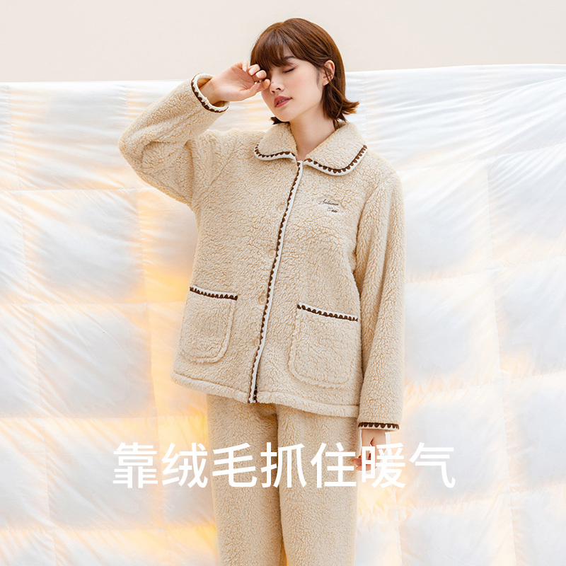大码 春秋开衫 女士家居服 加厚珊瑚绒睡衣女冬法兰绒加绒套装 秋冬季