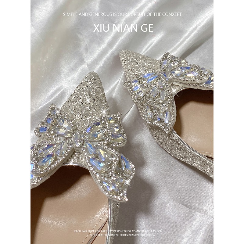 2024新款 宴会中跟不累脚舒适水晶高跟鞋 主婚纱新娘鞋 粗跟银色婚鞋