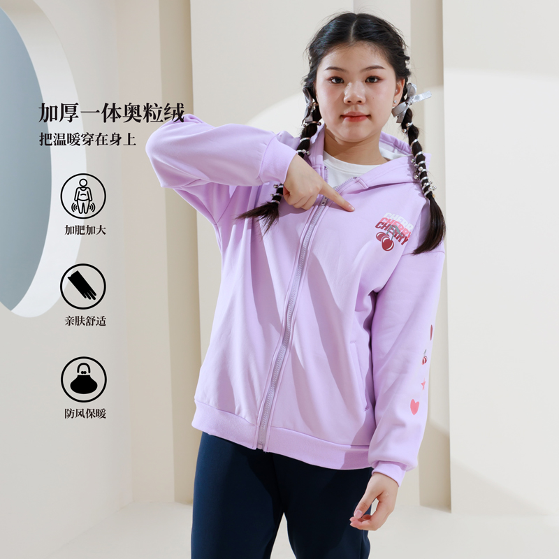 胖女童冬装 宽松保暖连帽上衣 中大童加肥加大加绒外套胖女孩大码