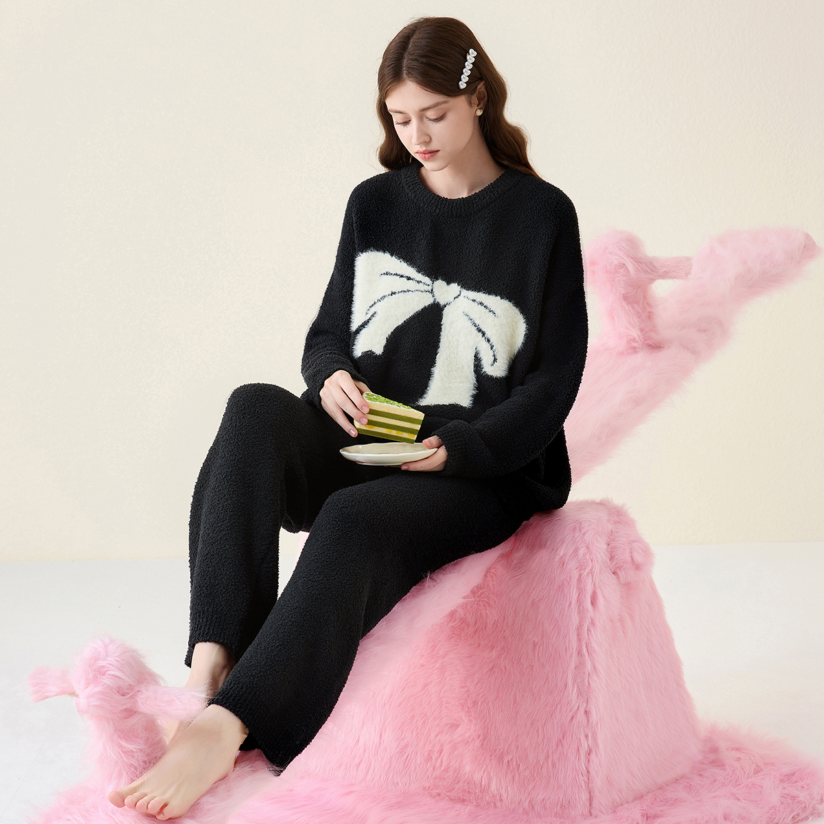 秋冬家居服珊瑚绒2025新款 半边绒睡衣女冬季 加绒加厚冬天黑色长袖