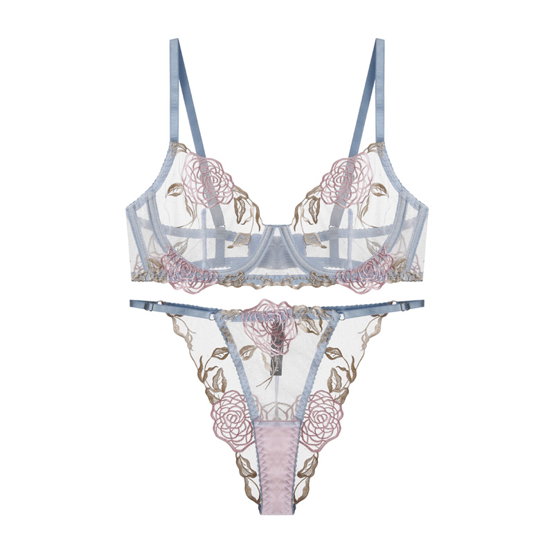 法式 透视聚拢大胸显小钢圈文胸欧美 性感超薄网纱刺绣内衣套装