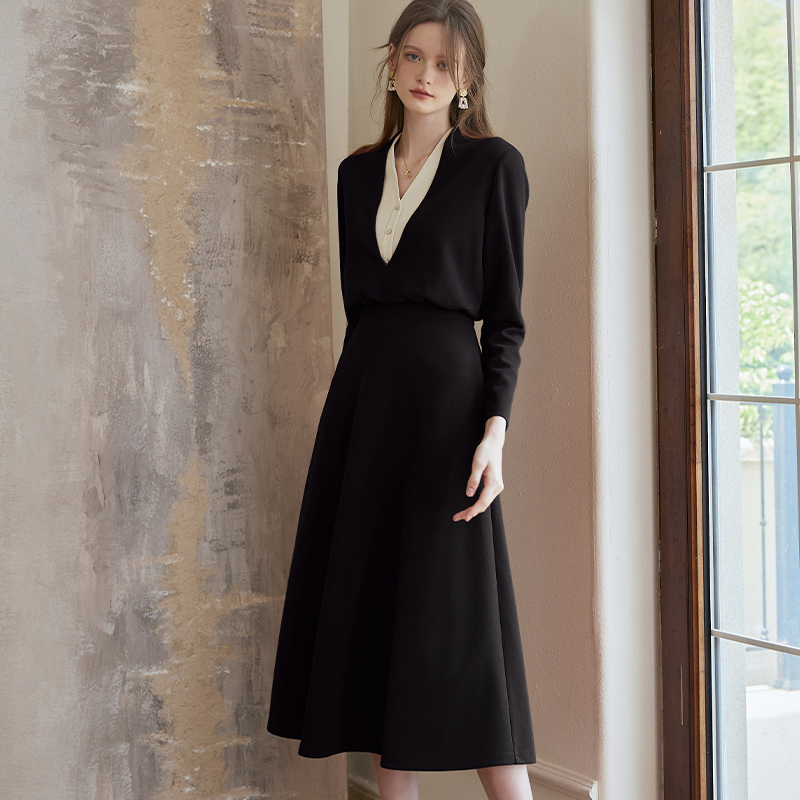 赫本风法式 太平鸟长袖 修身 中长款 船领收腰褶皱连衣裙女25春新款