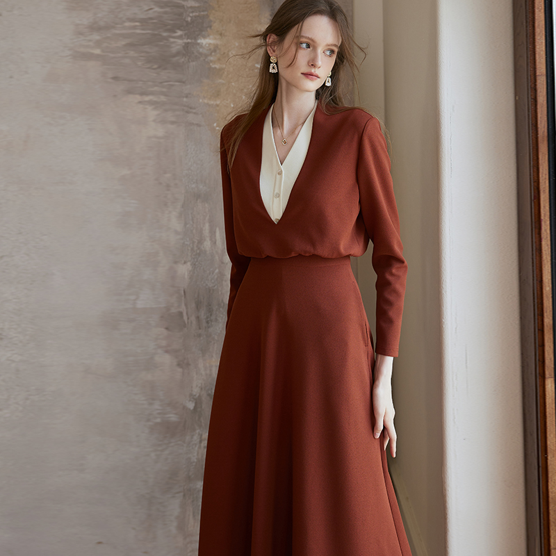 V领荷叶袖 套装 中长裙千金风32537D019 Moda连衣裙2025秋季 Vero
